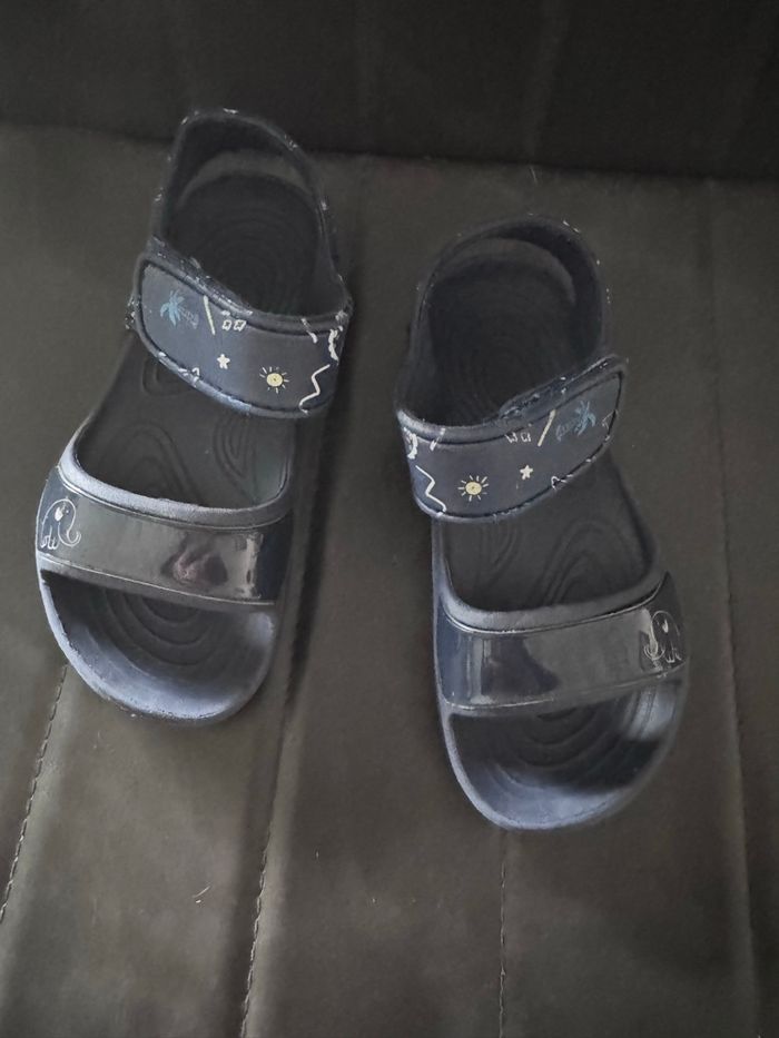 Je vends cette paire de sandales pour enfant dans des tons marins et turquoise. - Type de produit : Sandales - Univers : Enfant - Pointure : 27 - Couleur : Marine avec motifs - Matière : Synthétique N'hésitez pas à me contacter pour plus d'informations ou de photos.