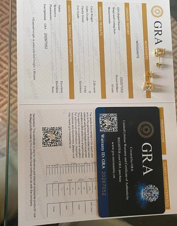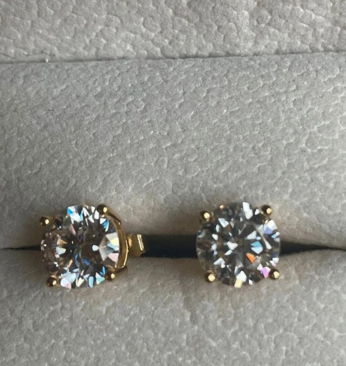 Boucles d'oreilles Argent plaqué or jaune (poinçon sur tige et fermoir) Moissanites 2cts chacune 4cts au total 1 certificat GRA pour les 2 boucles Jamais portees Livrées dans un pochon Ou Vendues dans un écrin en velours noir UNIQUEMENT si achat au prix affiché
