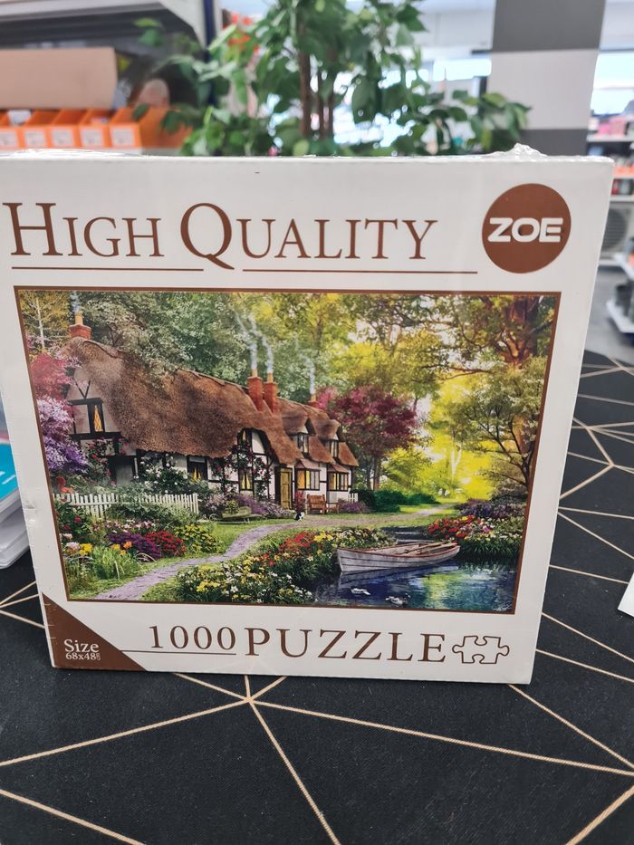 Je vends ce puzzle Zoe de 1000 pièces représentant un magnifique paysage de campagne anglaise. - Type de produit : Puzzle - Marque : Zoe - Taille : 1000 pièces - Dimensions du puzzle : 66 x 48 cm - Thème : Paysage de campagne anglaise avec maisons à colombages, jardin fleuri et rivière État neuf, jamais ouvert.