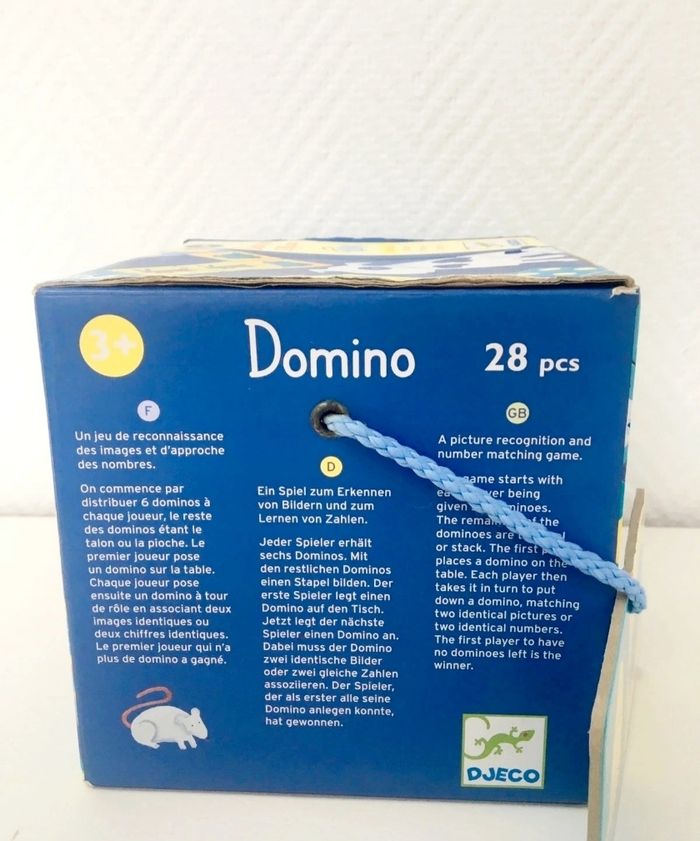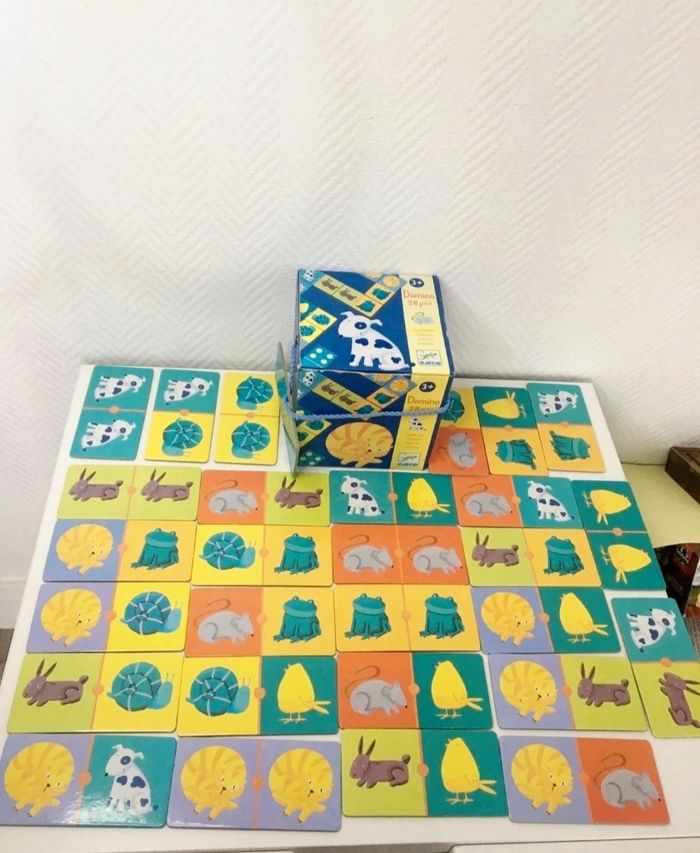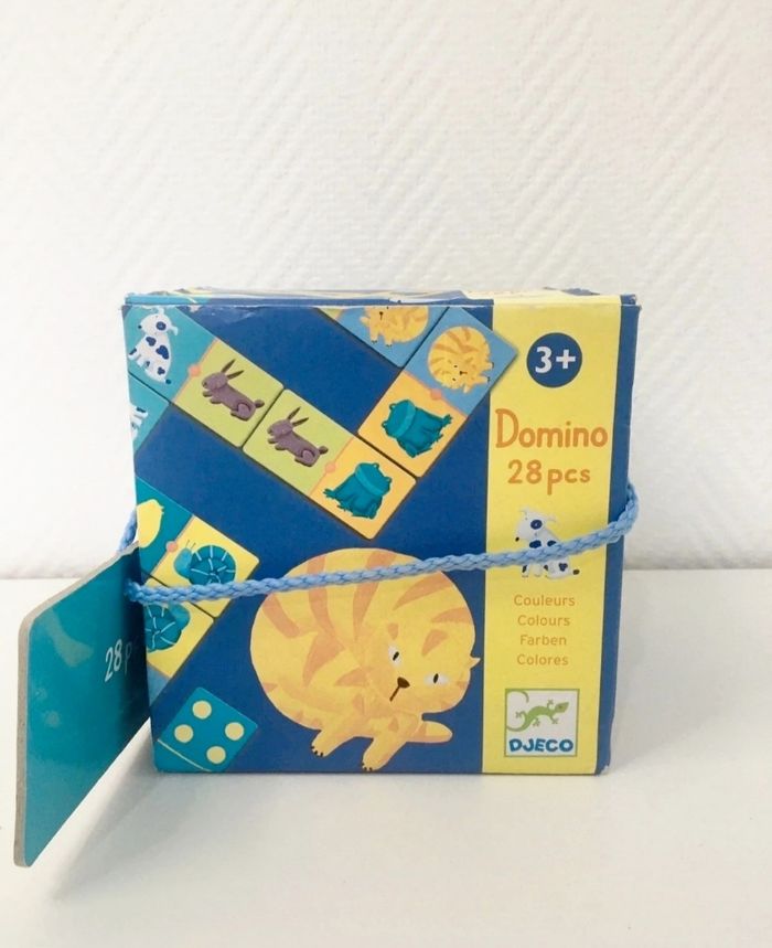 Jeu de dominos Djeco avec 28 pièces colorées. - Type de produit : Jeu de dominos - Marque : Djeco - Âge recommandé : 3 ans et + En très bon état Boite légèrement abîmée Complet Un jeu éducatif et amusant pour les enfants !