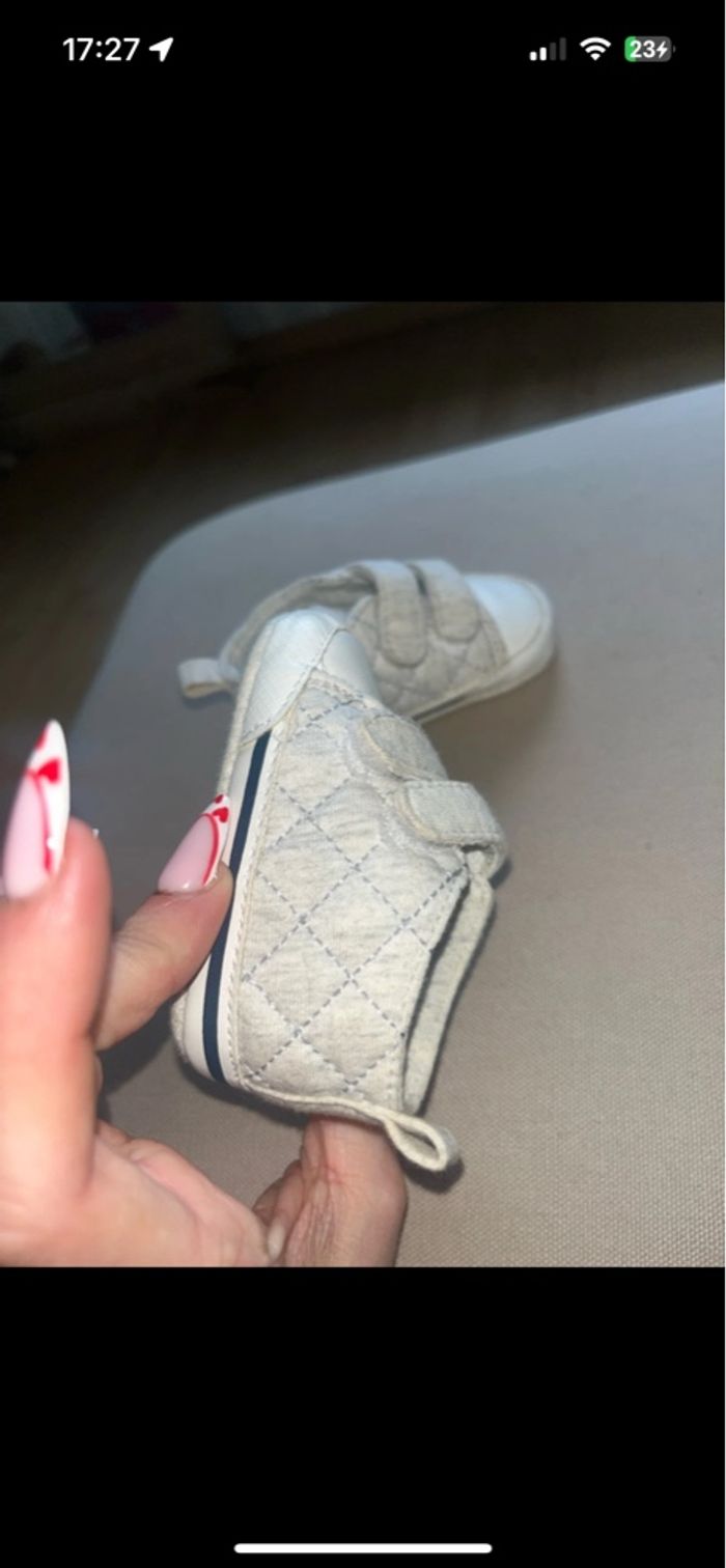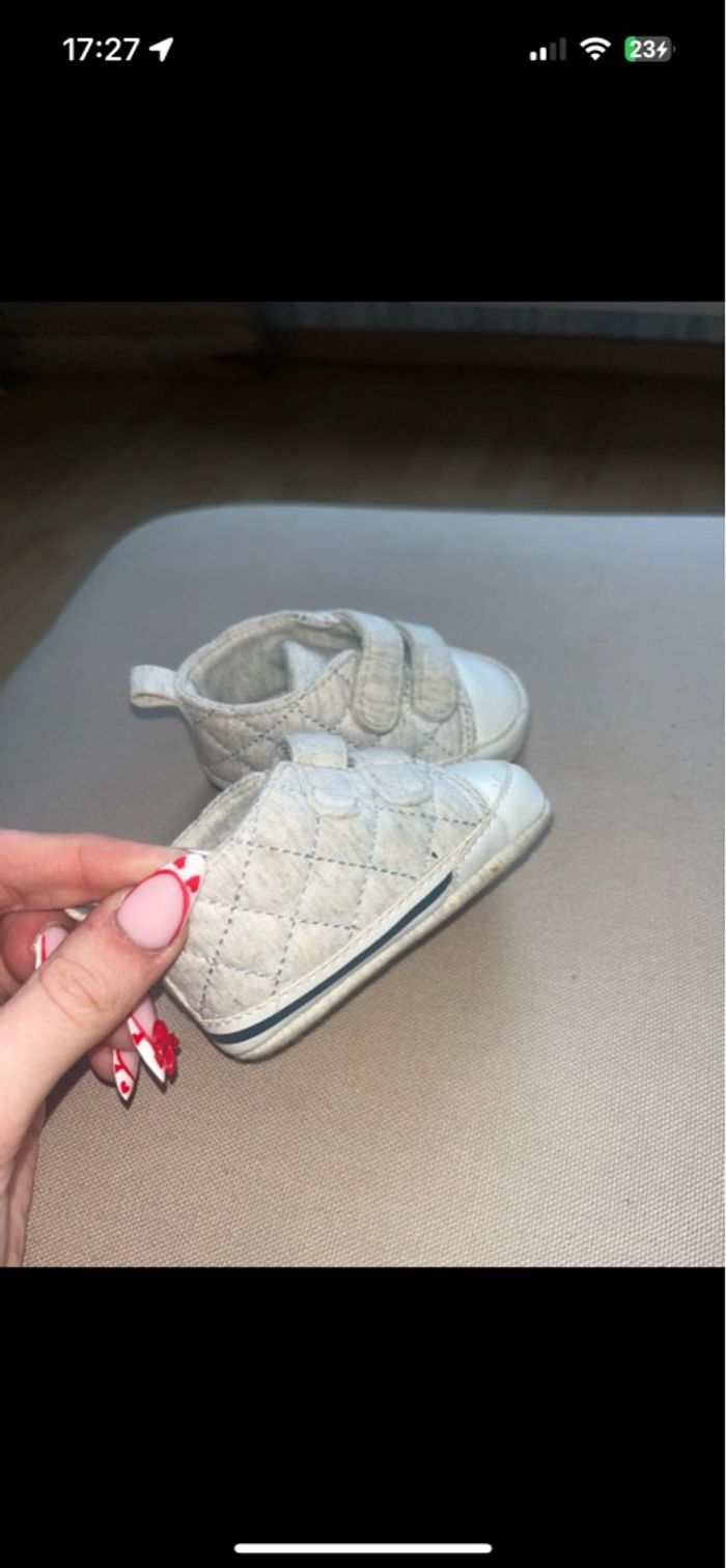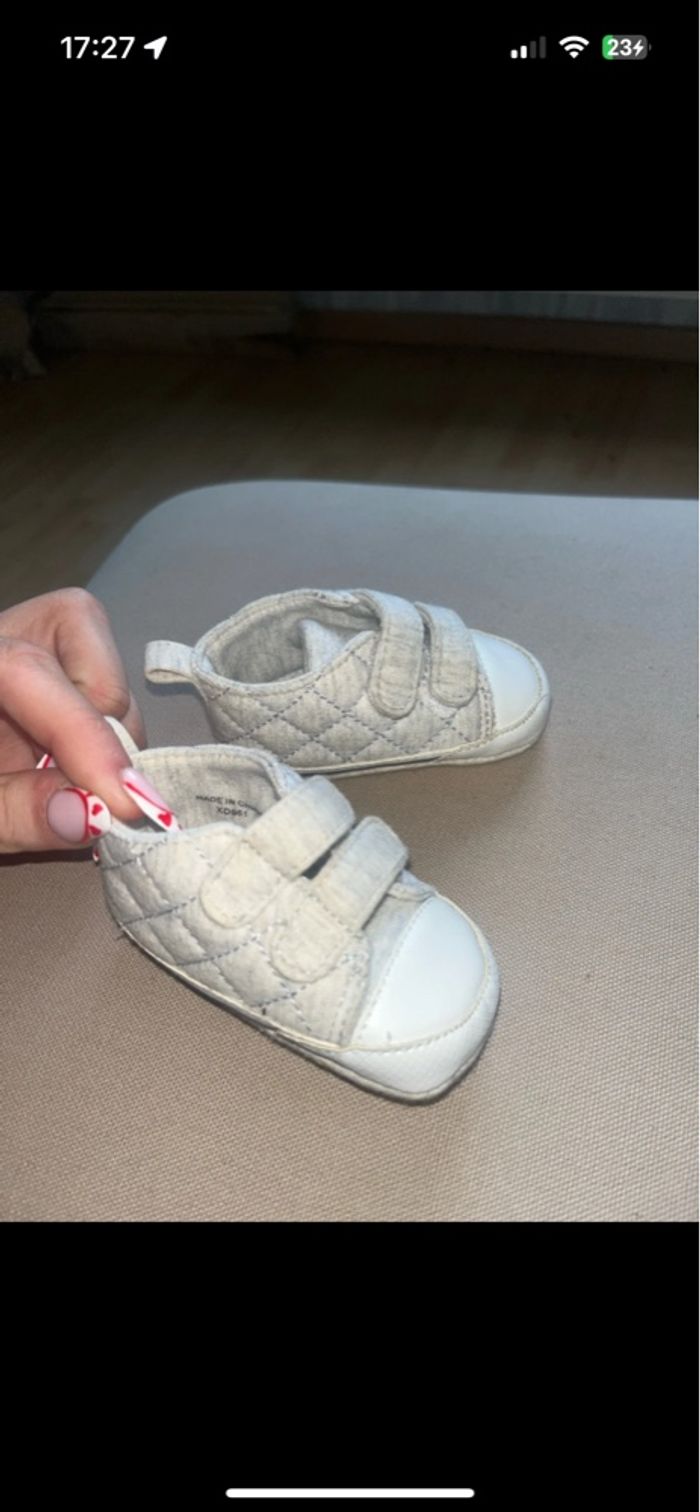 Paire chaussures souples en tissu à scratch Grise effet matelassé Bon état (petit coup de nettoyage + petite tache) Âge : 3/6 mois Pointure : correspond à un 17