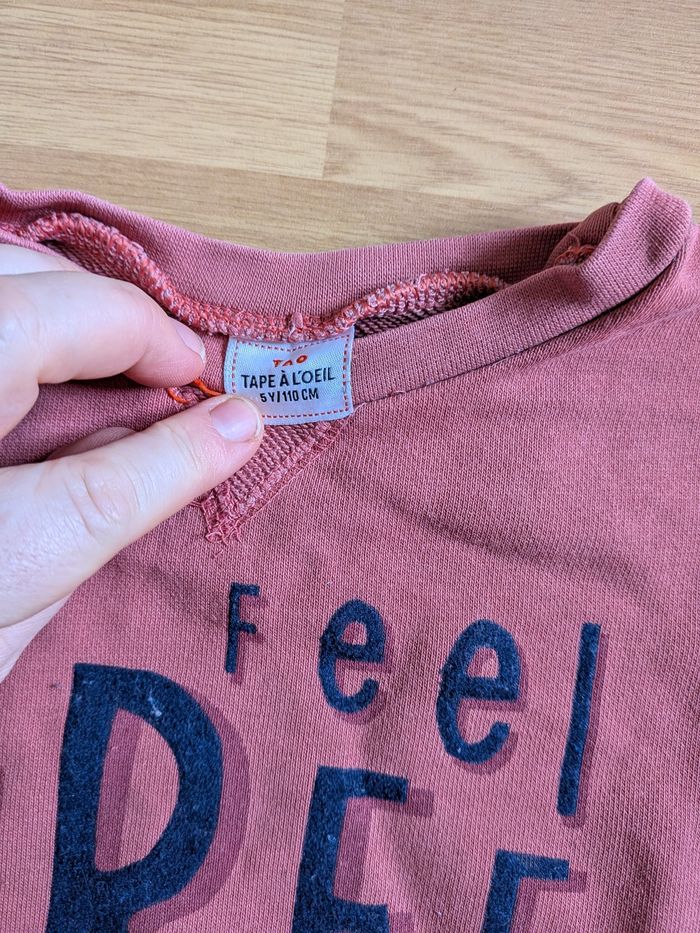 Sweat pour enfant de la marque Tape à l’Œil, taille 5 ans (110 cm). Coloris rose terracotta avec inscription “Feel Free” sur le devant. ✔️ Détails : Sweat confortable en coton Intérieur doux Manches texturées originales Parfait pour mi-saison / automne 📌 Composition : 80% coton, 20% polyester 📌 État : bon état général