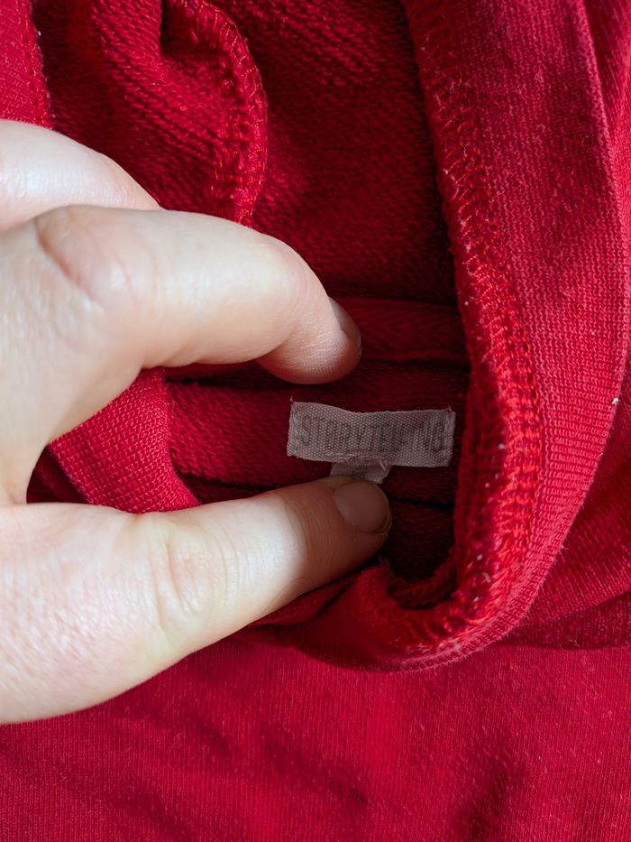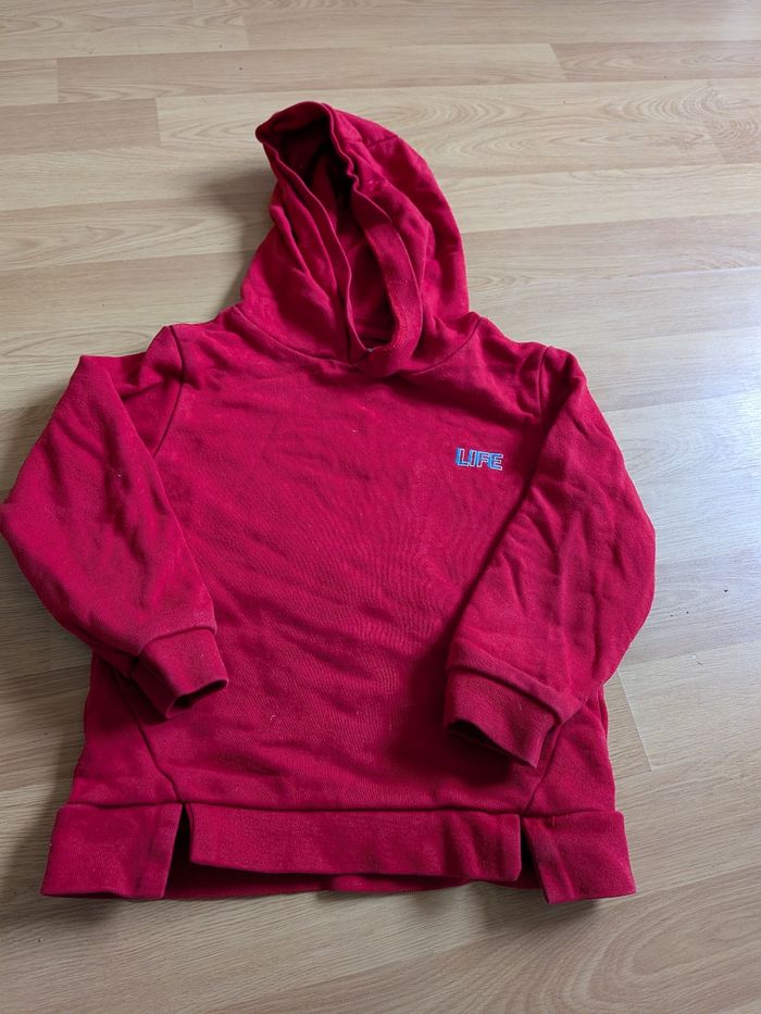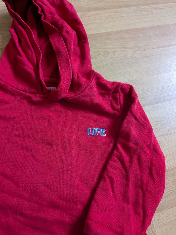 Sweat à capuche pour enfant de la marque storytelling, coloris rouge. Petit logo brodé “LIFE” sur la poitrine. ✔️ Détails : Hoodie confortable et chaud Capuche intégrée Style simple et passe-partout Idéal pour l’école ou le sport 📌 Taille : 6 ans 📌 État : bon état général