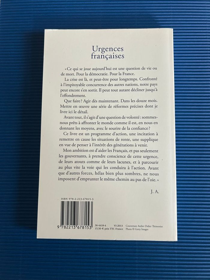 Je vends ce livre en parfait état Titre : Urgences françaises Auteur : Jacques Attali Editeur : Fayard Genre : Société - Culture Sous-genre : Economie Thème : Economie et entreprises, Conditions et politique économiques Format : Broché 236 pages Hauteur : 22 cm Largeur : 14 cm Epaisseur : 1 cm Résumé «Ce qui se joue aujourd'hui est une question de vie ou de mort. Pour la démocratie. Pour la France. La crise est là, et peut-être pour longtemps. Confronté à l'impitoyable concurrence des autres nations, notre pays peut encore s'en sortir. Il peut tout autant décliner jusqu à l'effondrement. Que faire ? Agir dès maintenant. Dans les douze mois. Mettre en oeuvre une série de réformes précises dont je livre ici le détail. Avant tout, il s'agit d'une question de volonté : sommes-nous prêts à affronter le monde comme Il est, en nous en donnant les moyens, avec le sourire de la confiance ? Ce livre est un programme d'action, une incitation à remettre en cause les situations de rente, une supplique en vue de penser à l'intérêt des générations à venir. Mon ambition est d'aider les Français, et pas seulement les gouvernants, à prendre conscience de cette urgence, de leurs atouts comme de leurs lacunes, et à parcourir au plus vite la voie qui les conduira à l'action. Avant que d'autres forces, hélas bien plus sombres, ne nous imposent d'emprunter le même chemin au pas de l'oie.» Envoi rapide et très soigné