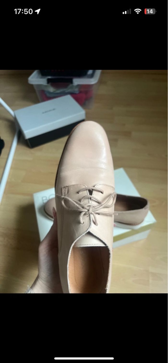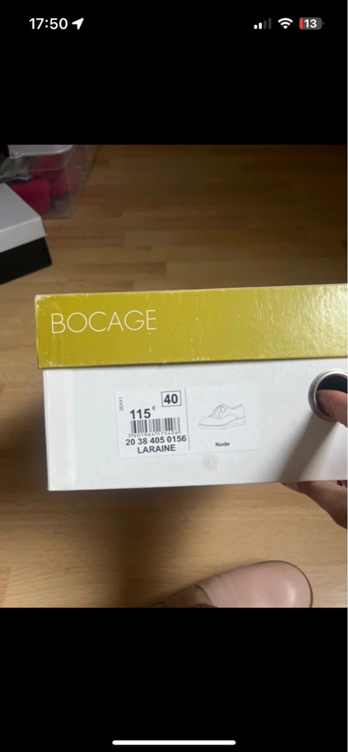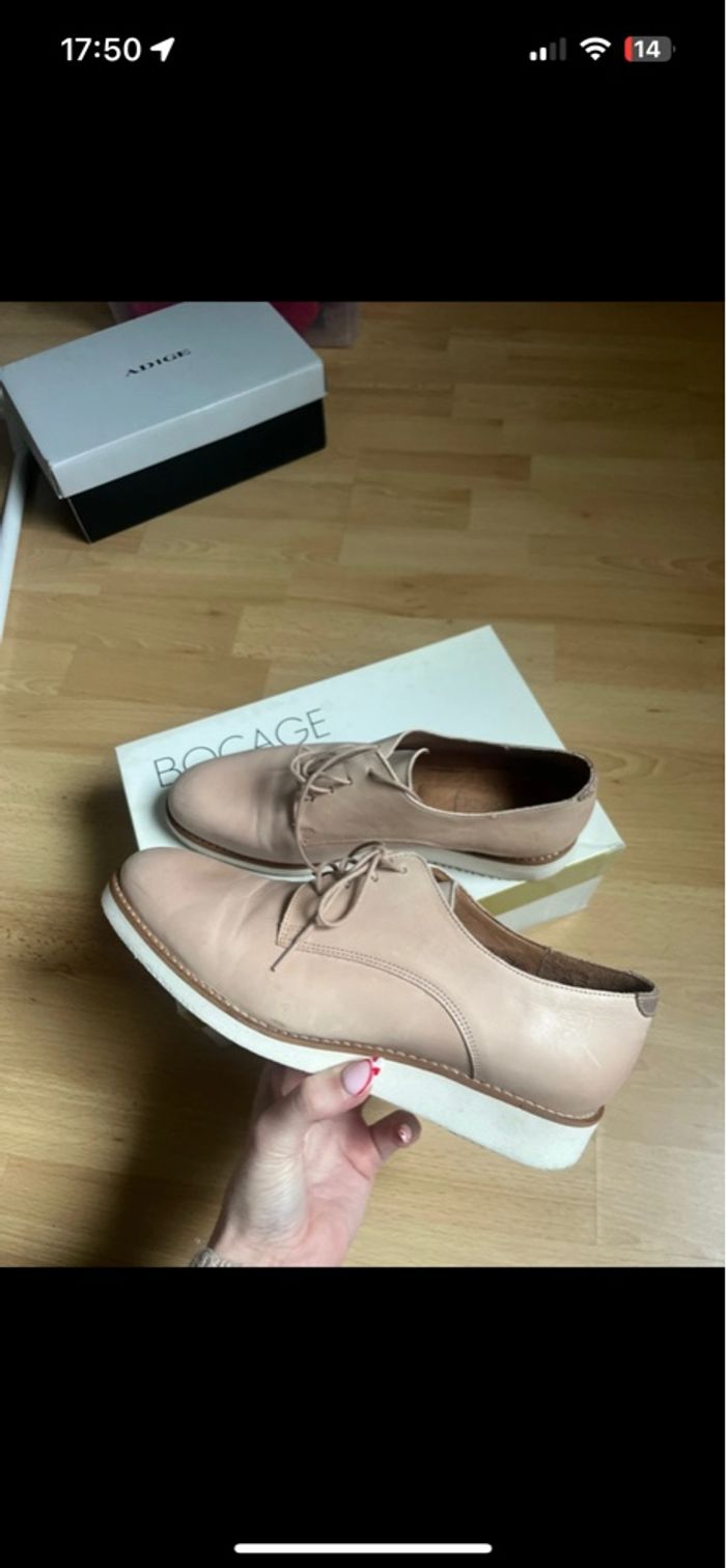 Paire chaussures type derbies Tout en cuir !!!! Nude/rose à lacets avec semelle blanche Très bon état (‼️ il faudra juste les nettoyer) Marque : Bocage (la paire neuve vaut 115€) Pointure 40