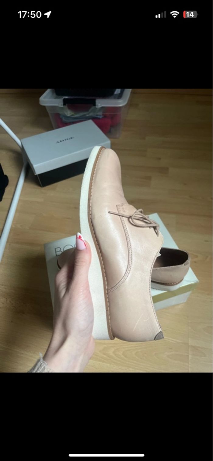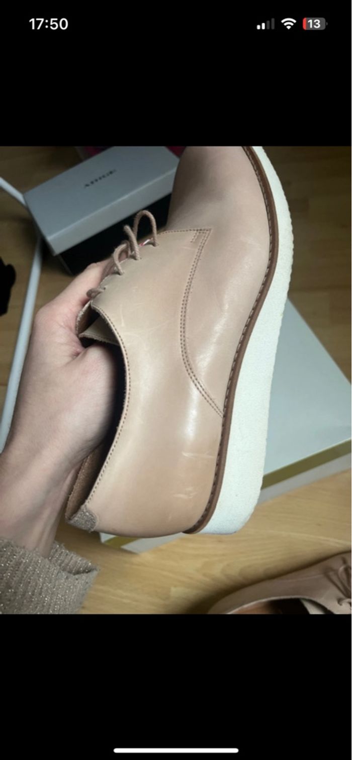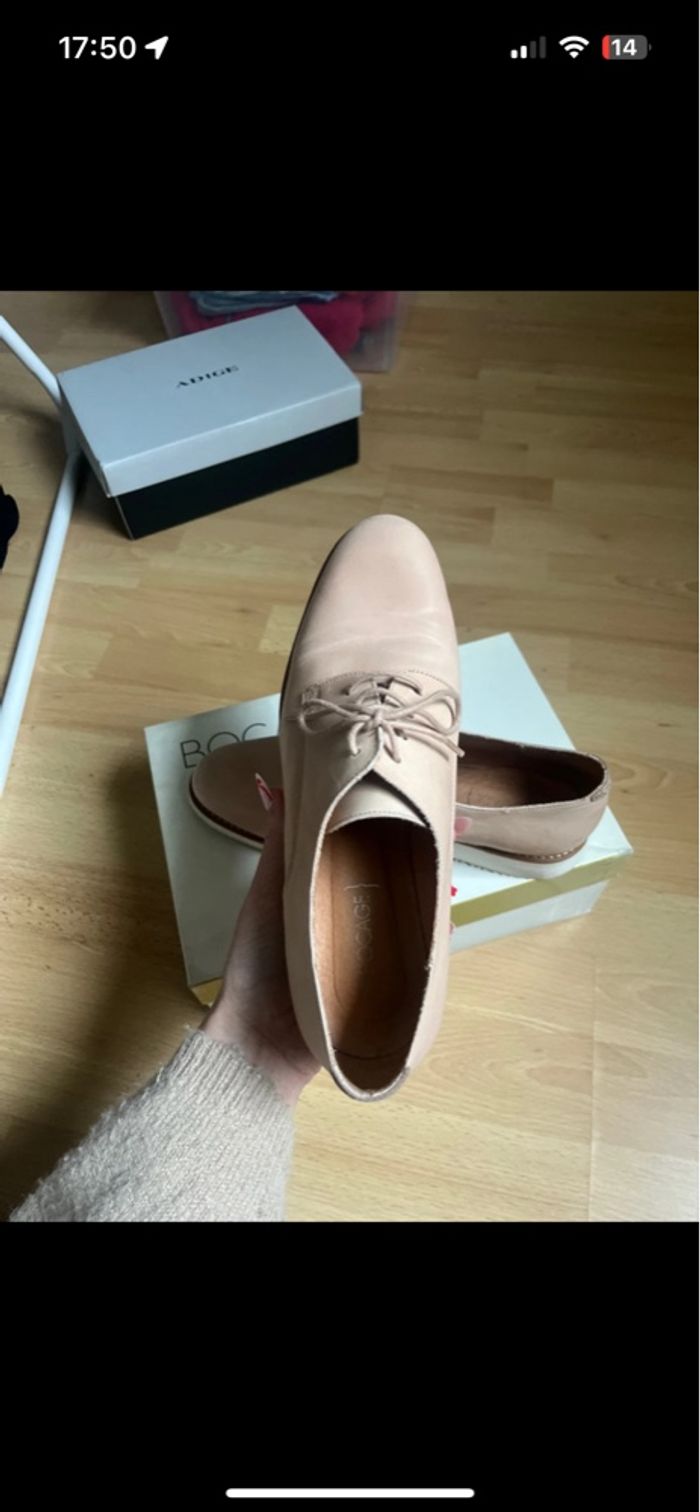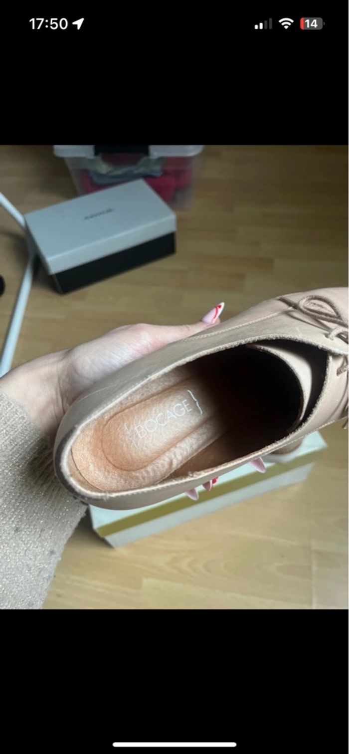 Paire chaussures type derbies Tout en cuir !!!! Nude/rose à lacets avec semelle blanche Très bon état (‼️ il faudra juste les nettoyer) Marque : Bocage (la paire neuve vaut 115€) Pointure 40