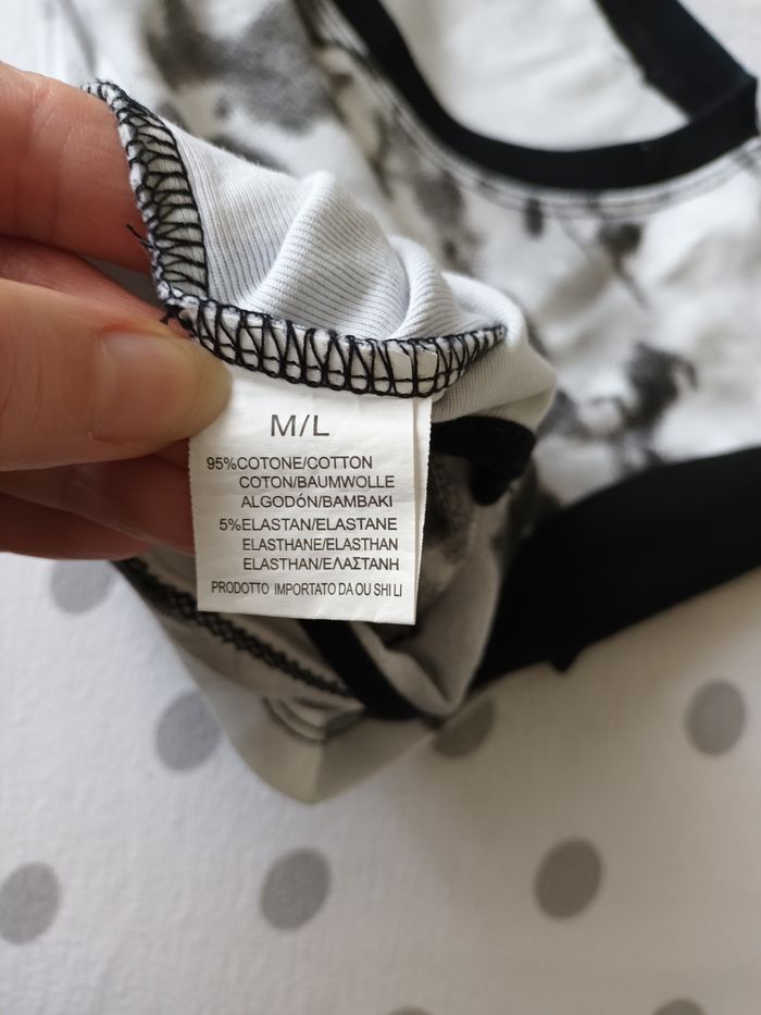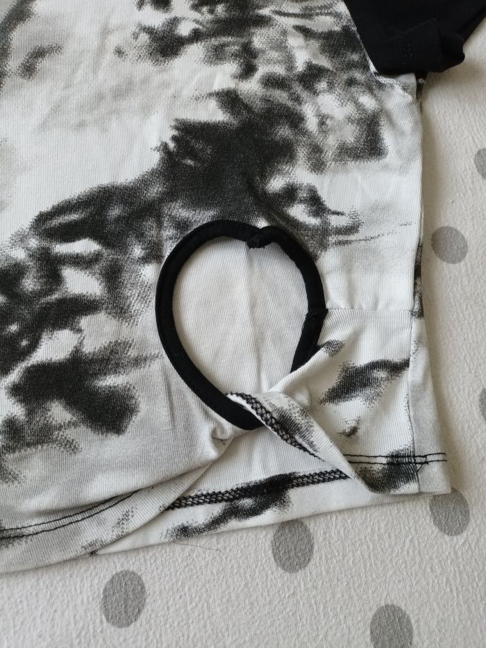 Crop top blanc et noir avec ouvertures sur le devant 95% coton, 5% elasthanne Étiqueté M/L mais acheté en Italie et correspond à une taille S Dimensions : Largeur des epaules : 37 cm Longueur : 43 cm Parfait état
