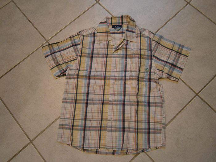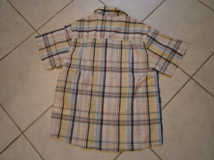 Chemisette à carreaux blanche/bleu/rouge et jaune. La photo est un peu foncée. Fermeture par boutons. Une poche sur la poitrine gauche. 100% coton. Taille 10 ans.