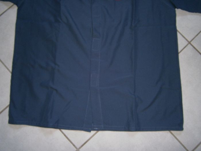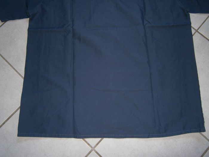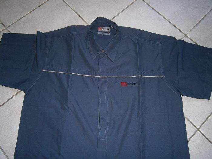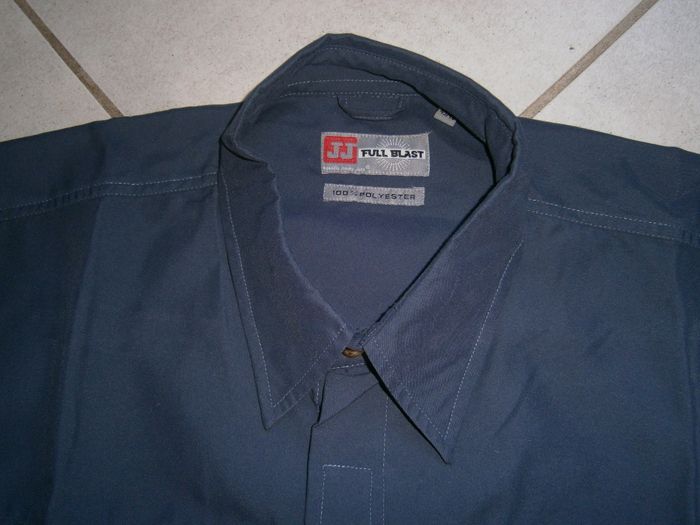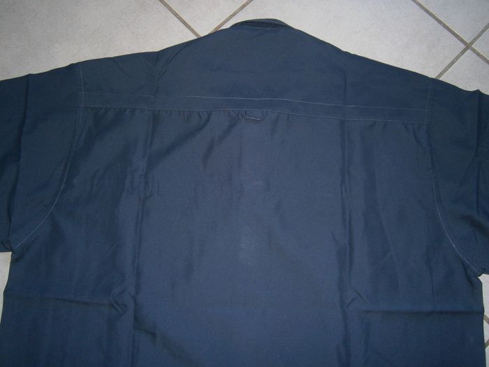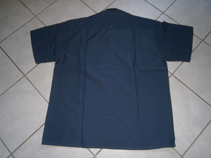 Chemisette à manches courtes. Couleur bleu. Fermeture par scratch et un bouton au col. 100% polyester. Dimensions : Aisselle/aisselle = 66 cm. Epaule/bas = 79 cm. Epaule/épaule = 57 cm. Taille XL.