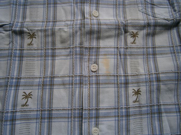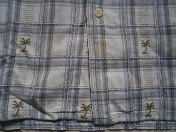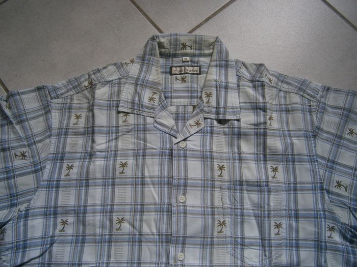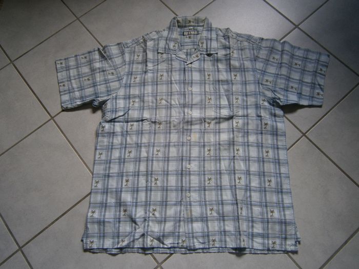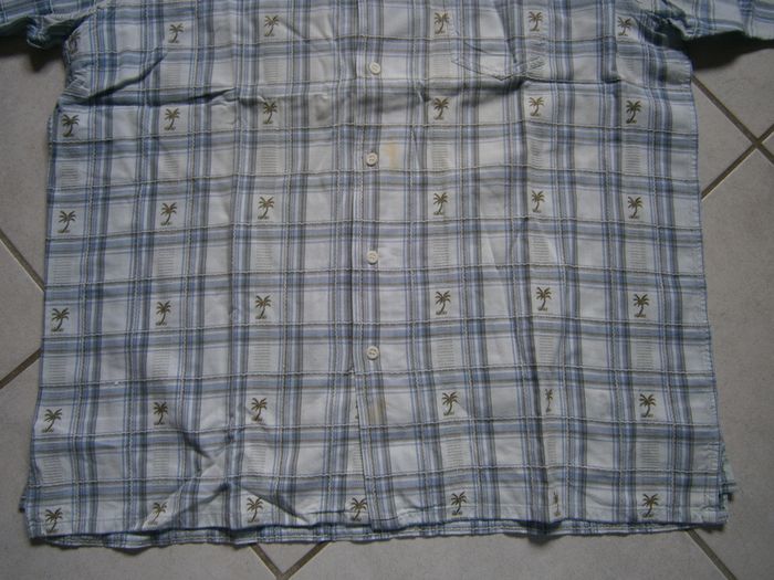 Chemisette imprimée. Carreaux gris et bleu, motif palmier kaki. Une poche poitrine à gauche. Boutons devant. Col jauni et 2 tâches devant (1 au centre et 1 au bas) : photos. Je ne sais pas si le jauni partira au lavage mais en coton elle peut être teintée sans difficulté. 100% coton. Dimensions : Aisselle/aisselle = 63 cm. Epaule/bas = 76 cm. Taille XL.