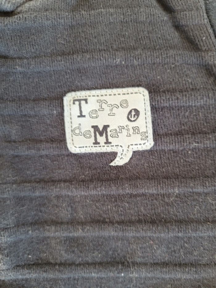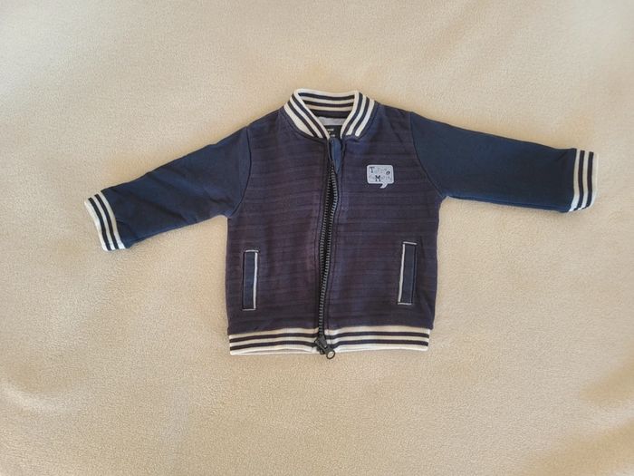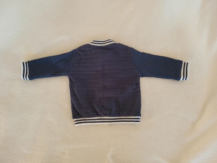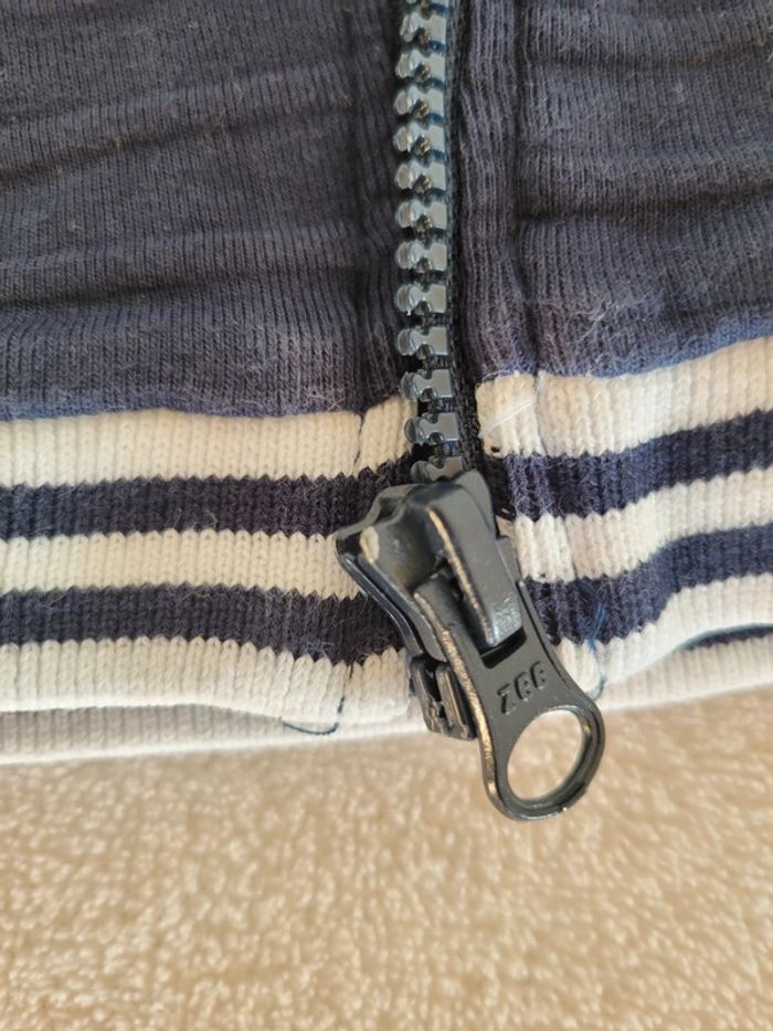 Veste manches longues Fermeture par zip 2 poches à l'avant Liseré blanc et bleu marine au niveau des poignets, du col et du bas du gilet /!\ Eclats de peinture au niveau de la fermeture zip