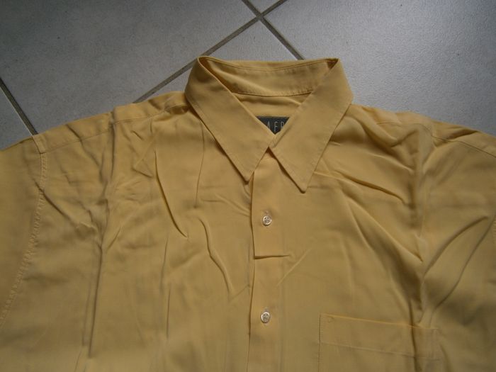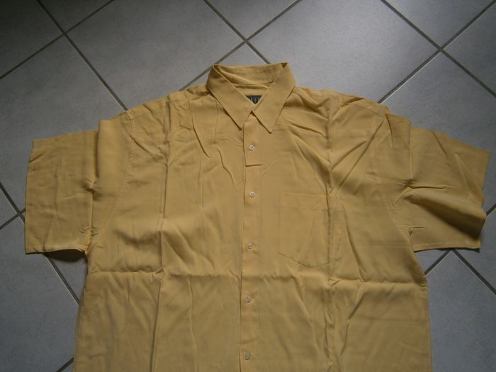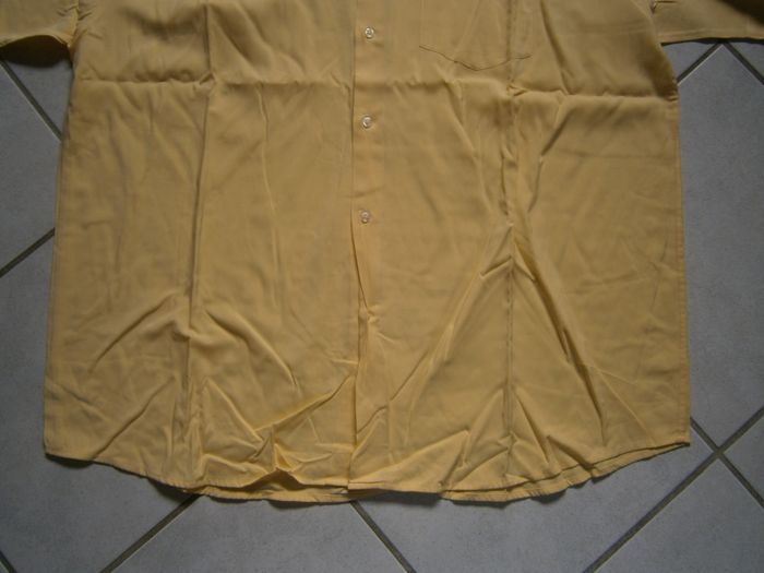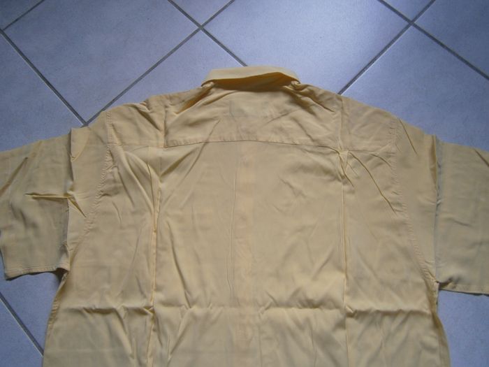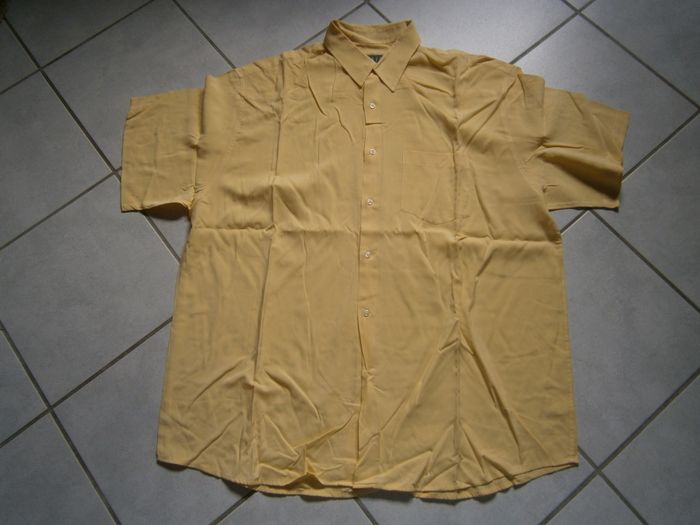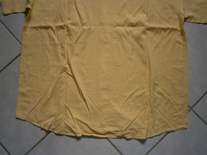 Chemisette unie jaune. Boutons devant. Poche poitrine à gauche. Dimensions : Aisselle/aisselle = 65 cm. Epaule/bas = 80 cm. Très légère à porter mais pas d'étiquette de composition. Se chiffonne facilement. Taille 5 (43-44)/XL.