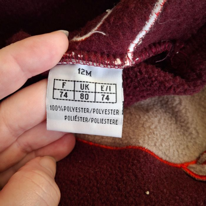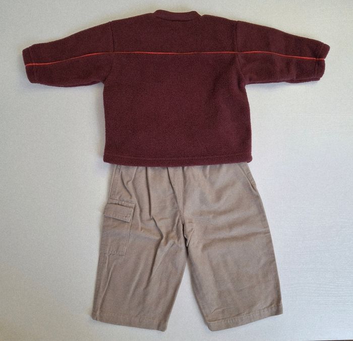 Ensemble bébé garçon taille 12 mois en très bon état. Comprend pull polaire chaud bordeaux avec motif ours et pantalon assorti beige. Tenue confortable et pratique pour l’hiver. Taille 12 mois (74 cm). Très bon état général, propre. Vendu tel que sur photos.