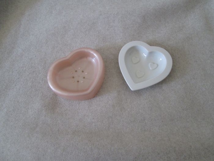 Vends lot de 2 porte-savons. - 1 en forme de cœur rose - 1 en forme de cœur blanc en céramique. Le rose est en excellent état, très peu utilisé. Le blanc est neuf. N'hésitez pas à consulter mes autres annonces.