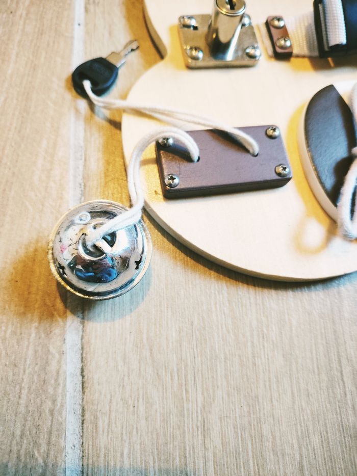 ✨ Serrures et loquets : Verrou à glissière, crochet métallique et serrure avec sa clé (attachée par un cordon pour ne pas la perdre).