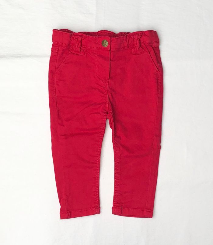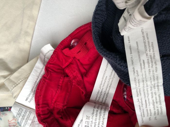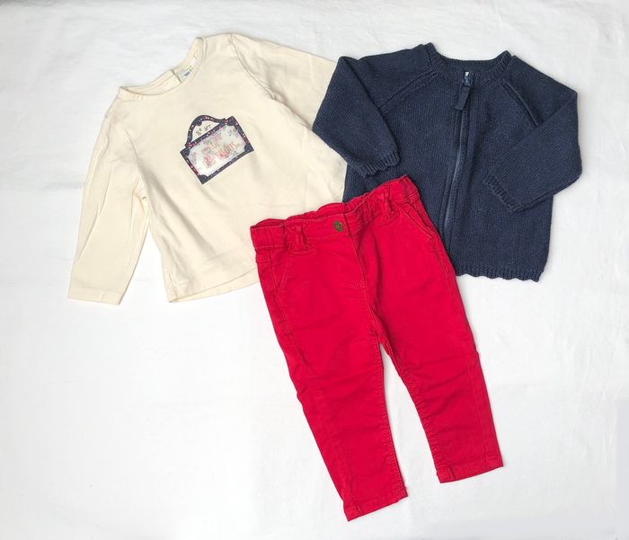 Ensemble 3 pièces Tape à l’œil, Taille 6 mois/ 68 cm, Hiver/ mi-saison. -T-shirt manches longues en coton, De couleur crème, inscription « rue des bisous » avec des fleurs sur l’avant. Pli d’aisance et ouverture par pression dans le dos. -Pantalon épais, extensible, en coton/ élasthanne, D’une magnifique couleur rose framboise, bien vive, Passants en forme de nœuds. Taille réglable avec des élastique, ouverture par une pression, Taille plutôt grand. -Gilet mi-épais principalement en coton. Bleu marine avec un fil brillant ton sur ton, ce qui lui donne un aspect légèrement pailleté. Petites vagues au bout des manches et en bas du gilet. Ouverture zippée. Lot en très bon état, sans trou ni tache. La couleur du pantalon n’est pas délavée. A noter des bouloches sous les manches du gilet. Cf photo. 🌸 Vous aimez cet article ? N’oubliez pas de visiter le reste de mon dressing en filtrant les tailles.