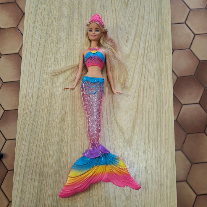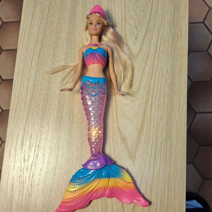 Poupée Barbie sirène avec queue transparente qui s’illumine en plusieurs couleurs (rose, bleu, violet…). Effet lumineux très joli, fonctionne parfaitement. ✔️ Très bon état ✔️ Cheveux longs blonds avec mèches roses ✔️ Diadème et tenue d’origine ✔️ Lumières OK (voir photos) Idéale pour jouer, collection Barbie ou cadeau. Maison non-fumeur.