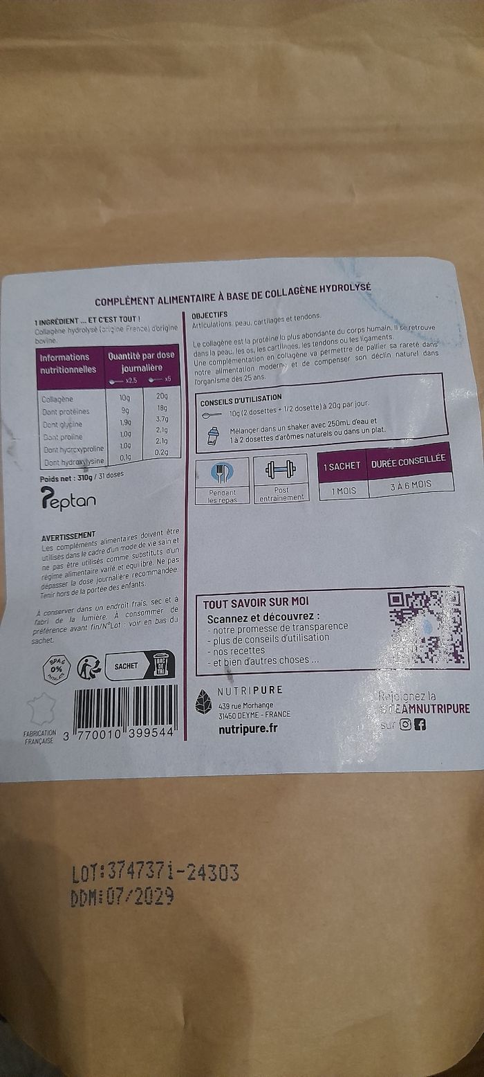 Collagène bovin 310 g 07/2029 Manque francaise Nutripure