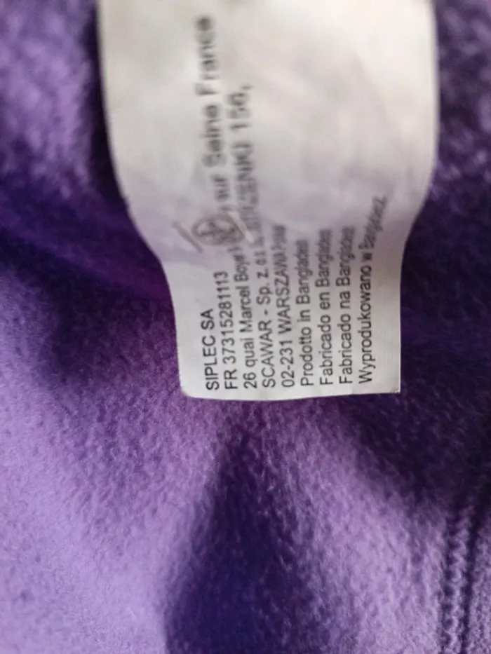 Sweat polaire zippé Leclerc 9M. Violet. 100% polyester. TBE