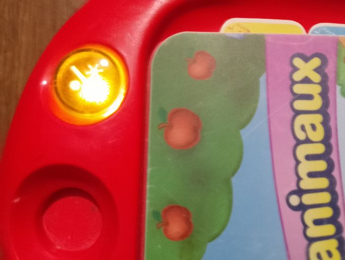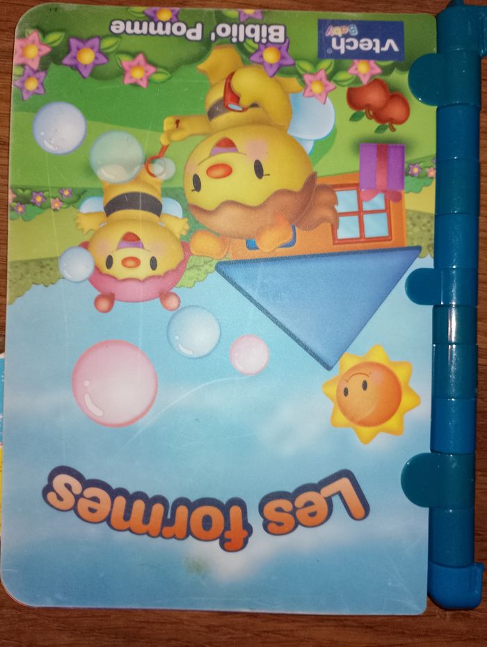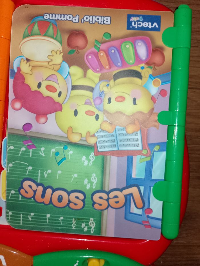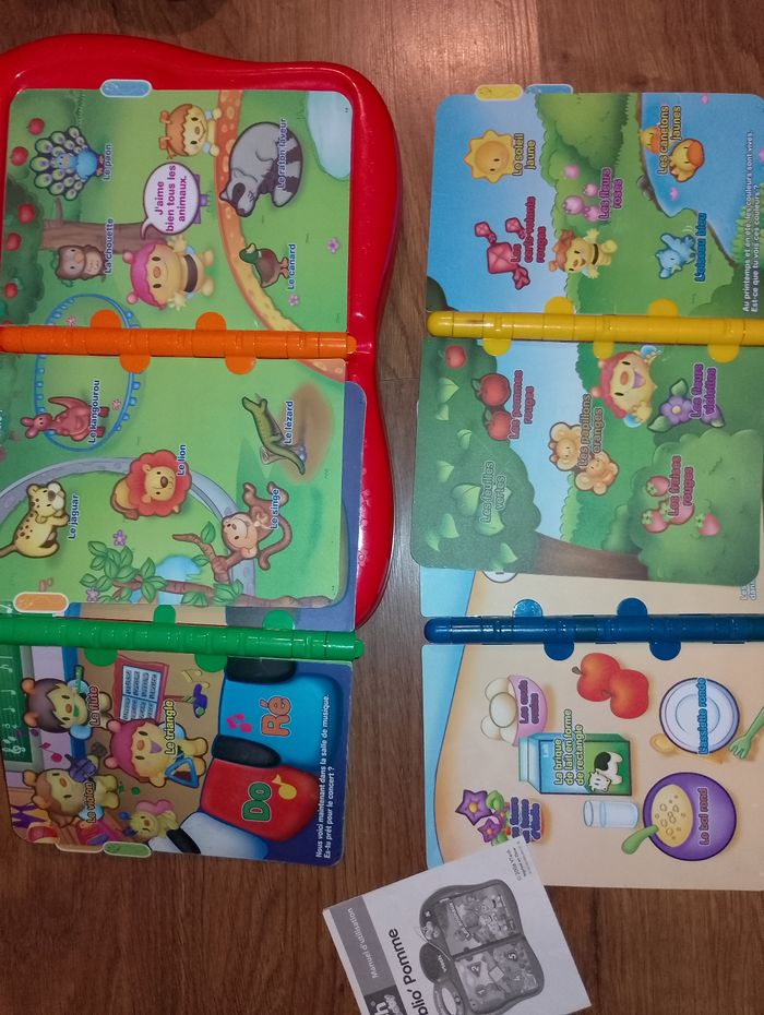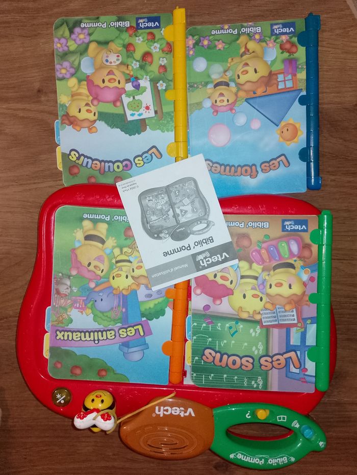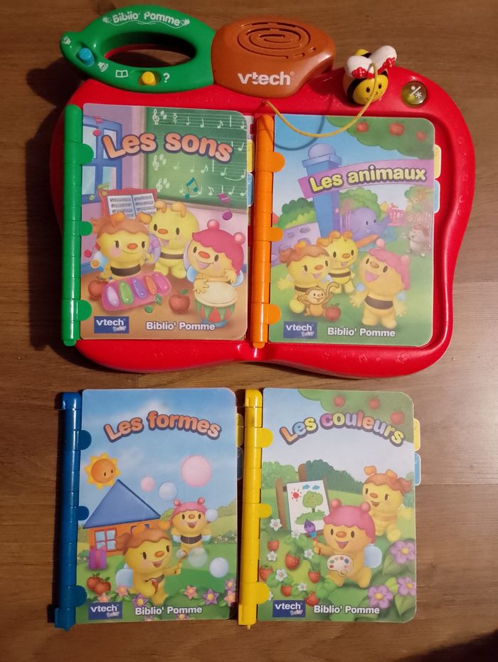 Biblio'pomme de VTech Jeu de découverte Vtech des couleurs, des formes, des sons et des animaux de12 à 36 mois Une base interactive et 4 livres pour l'éveil de Bébé ! Chacun des livres correspond à un apprentissage : formes, couleurs, sons, animaux. Chaque livre est reconnu automatiquement par la base. Grâce à labeille magique, les livres prennent vie : Bébé déclenche le nom des objets et des animaux, des sons familiers... 4 livres en plastique indéchirable inclus (se rangent sous la base) 2 modes de jeu : découverte ou question 10 mélodies bon état fonctionne à pile
