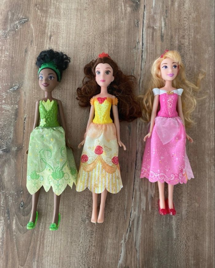 Lot de 3 Poupées Comme neuves (1 paires de chaussures manquante) - la princesse et la grenouille - la belle et la bête - la princesse au bois dormant