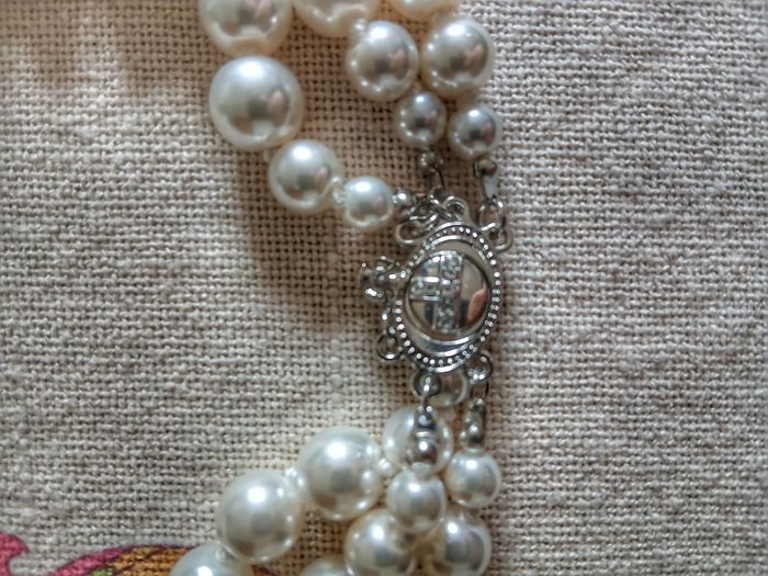 Collier perlé avec pendentif Orb argenté ✨ Magnifique collier composé de plusieurs rangs de perles blanches lumineuses, du bijou et son pendentif Orb argenté pavé de strass brillants, accompagné d’une croix signature au sommet. Détails : Couleur : perles blanches nacrées Pendentif : finition argentée avec strass Fermoir : mousqueton argenté Envoi rapide et soigné