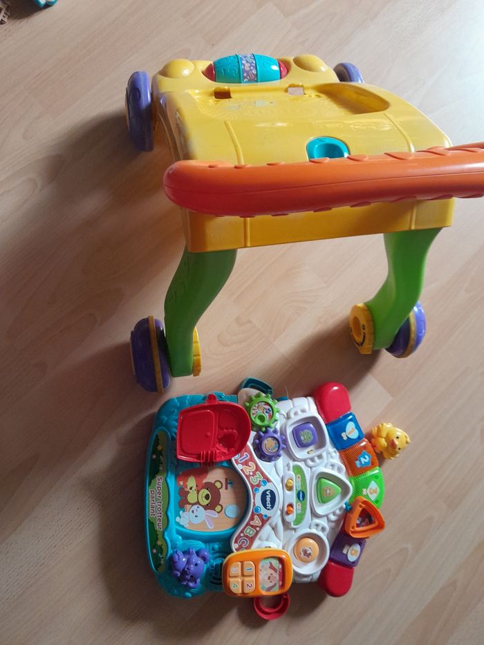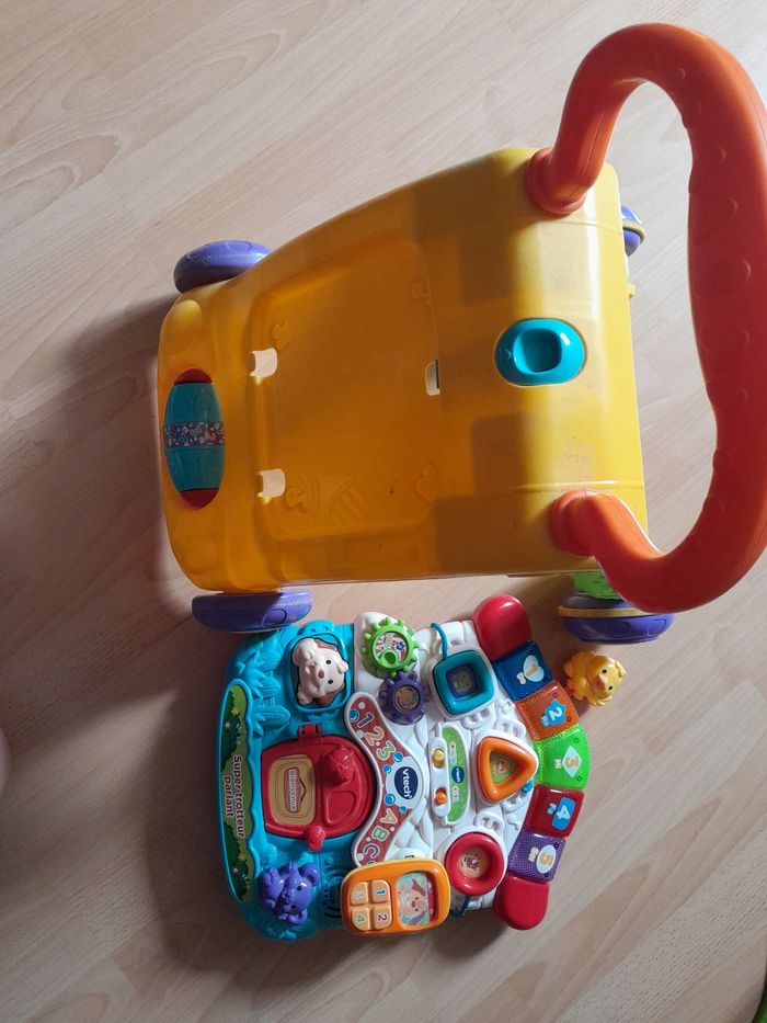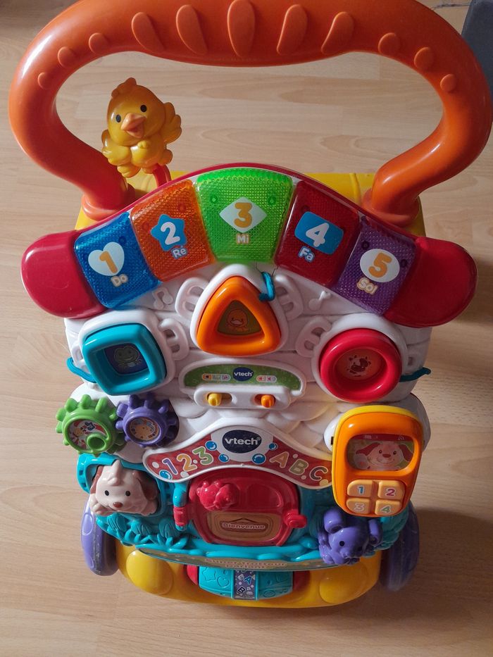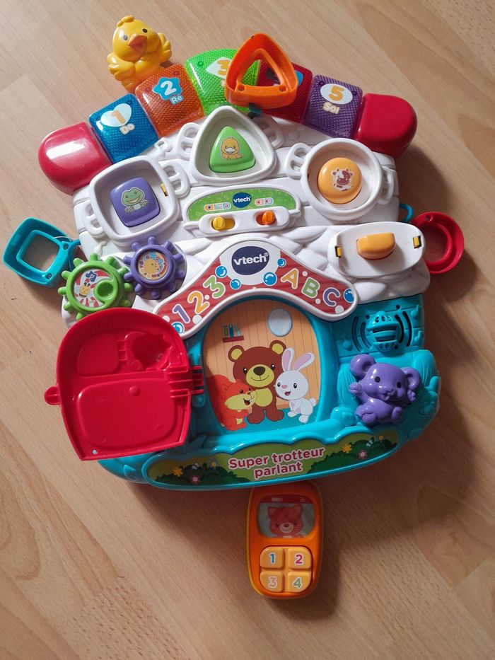 Il est composé d'un tableau d'éveil avec des touches de différentes formes et couleurs, des petits jeux, un téléphone. Il est détachable et peut s'accrocher ensuite sur le trotteur. Produit en très bon état, acheté neuf