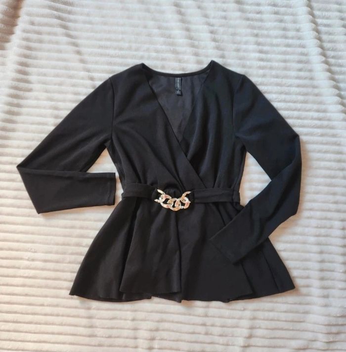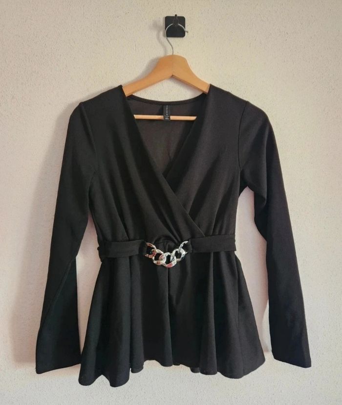 Blouse noire cache-cœur – Ceinture chaîne argentée – Taille S – Amisu – Neuve - photo numéro 1