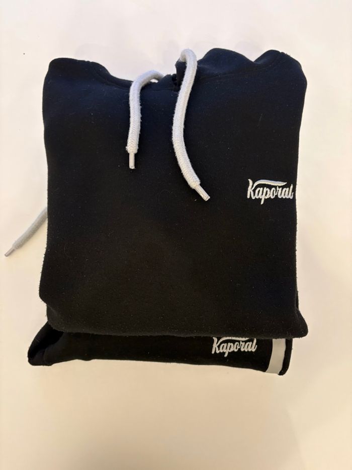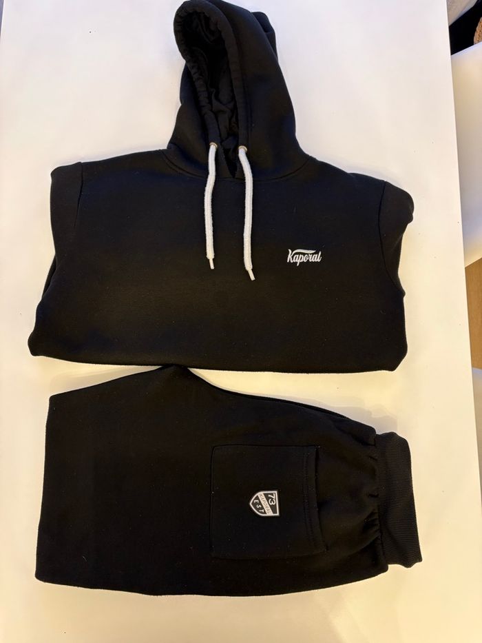 Bonjour je vends ensemble de jogging complet pour homme de la marque Kaporal, coloris noir classique. Coupe confortable avec cordons de serrage contrastés blancs, logo Kaporal brodé sur la poitrine et écusson sur la manche. Taille élastiquée, logo sur la jambe et poche arrière avec écusson Kaporal "73 " En bonne état général. Envoie rapide et soigné.📦