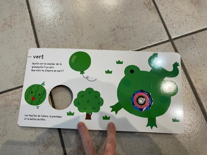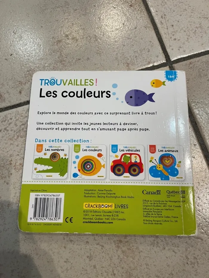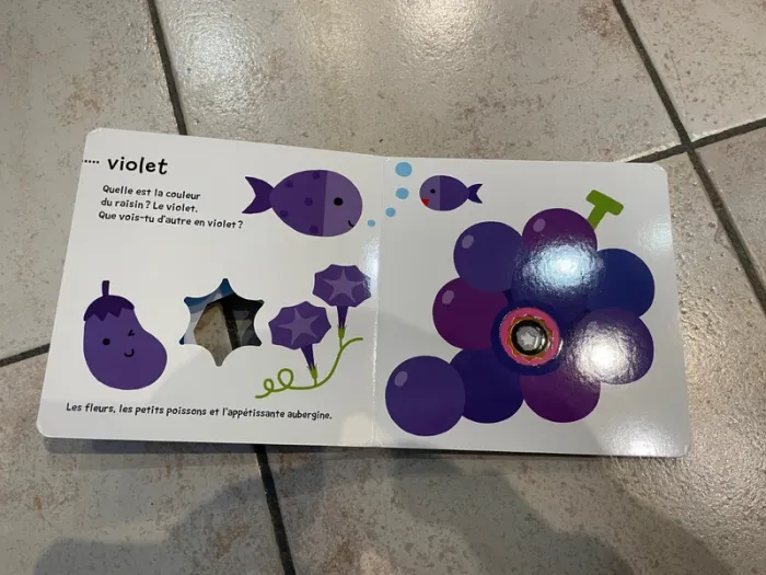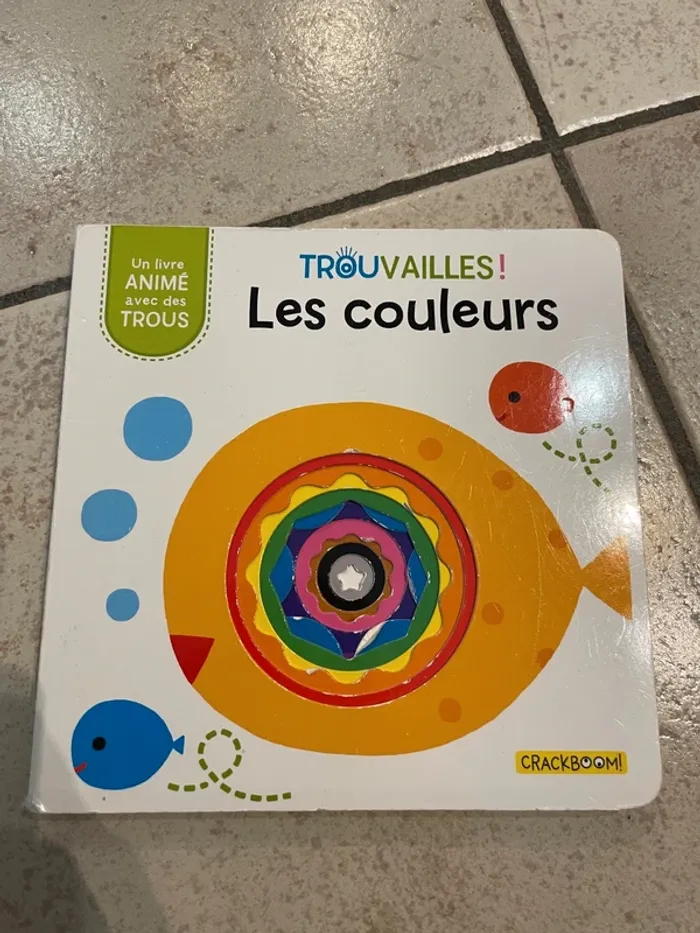 Livre cartonné pour bébé / enfant "Trouvailles! Les couleurs" L'intérieur du livre est en bon état par contre il y a des défauts sur la couverture (notamment la tranche du livre) voir les photos.