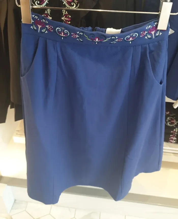 Jupe bleue midi, centré à la taille, avec décorations au niveau de la ceinture. Inspiré des vetements d'Anna dans Frozen (La reine des neiges). Taille à sa taille. Marque Her Universe en collaboration avec Disney. Demandez votre taille (XS-XL). Neuf (pickup).