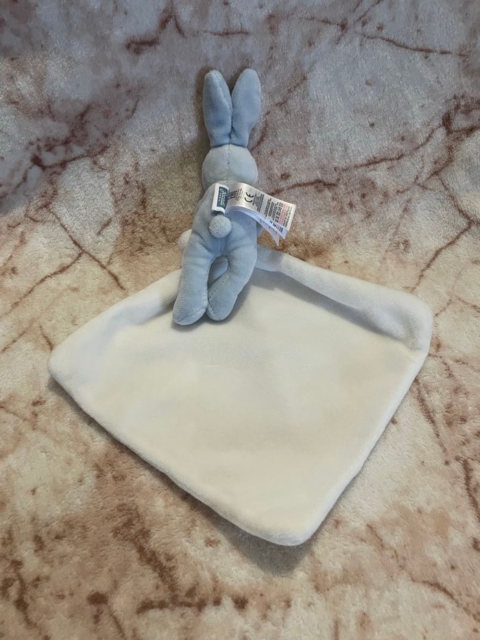 Doudou lapin bleu qui tient un mouchoir blanc entre ses mains Lapin +/- 17cm Mouchoir +/- 20cm Jacadi Occasion en très bon état Vous achetez le doudou que vous voyez sur la photo