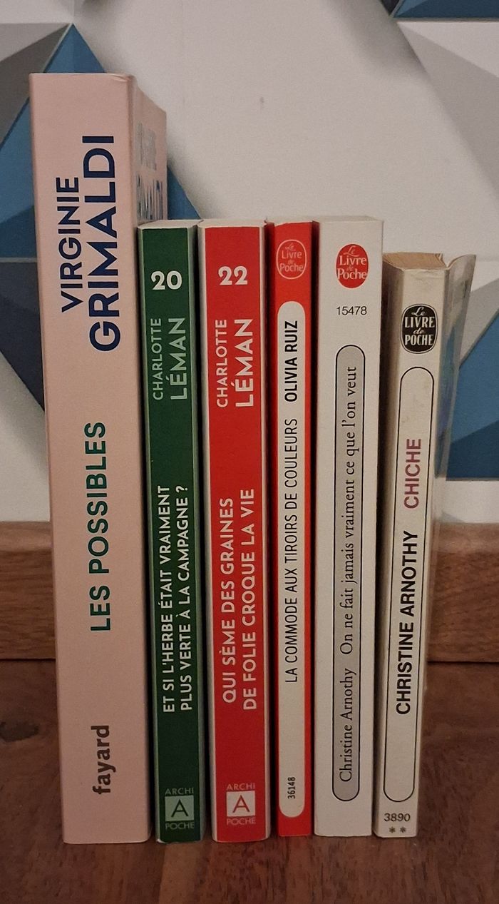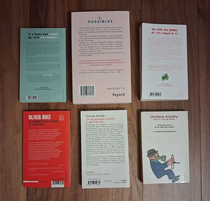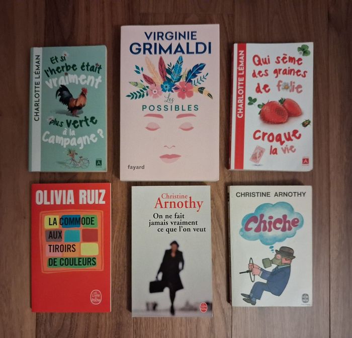 ✏️ Et si l’herbe était plus verte à la campagne ? Charlotte Léman Edition Archi Poche Très bon état Prix éditeur : 8.95 € ✏️ Les possibles Virginie Grimaldi Edition Fayard Prix éditeur : 19.50€ Très bon état ✏️ Qui sème des graines de folie croque la vie Charlotte Léman Edition Archi Poche Très bon état Prix éditeur : 8.95 € ✏️ La commode aux tiroirs de couleurs Olivia Ruiz Edition Le livre de poche Prix éditeur : 7,40 € Très bon état ✏️ On ne fait jamais vraiment ce qu l’on veut Christine Arnothy Edition Le livre de poche Très bon état ✏️ Chiche (Offert pour l’achat du lot) Christine Arnothy Edition Le livre de poche Bon état - jauni Il s’agit de livres d’occasion, ils présentent donc des traces d’utilisation ou des marques sur les couvertures. N’hésitez pas à demander des photos supplémentaires en cas de besoin. Livraison acceptée Ou remise en main propre possible sur Paris (Bibliothèque François Mitterrand, Gare de Lyon), La Défense, Etampes, etc...
