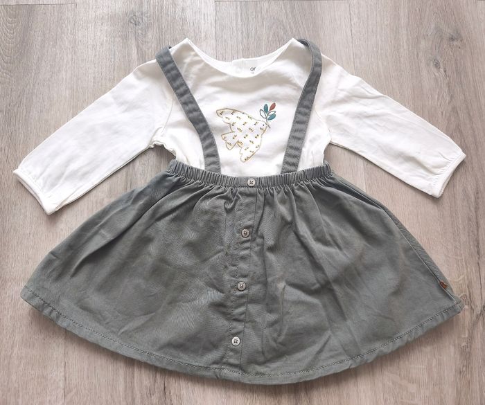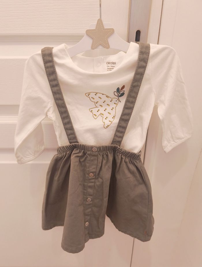 👗 Ensemble jupe à bretelles à taille élastiquée ceinturée et t-shirt manches longues. Facile à enfiler. Les bretelles sont réglables par boutons. 🏷️ Obaïbi 🪡 12 Mois / 74cm 🌈 Kaki / Blanc 👌 Très bon état (pas de tâche, pas de trou). Acheté neuf, jupe jamais portée et tee-shirt porté peu de fois 🍂 Mi-saison 🏡 Maison non-fumeur et sans animal 📦 Envoi rapide et soigné 💬 Contact pour plus d’infos ou photos