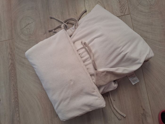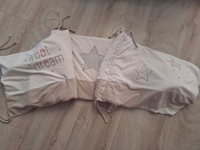 Tour de lit bébé mixte beige sans marque. Bon état il manque une attache non gênant. Nombreux vêtements disponibles en différentes tailles n'hésitez pas à jeter un coup d'œil petits prix Réduction sur lot activée