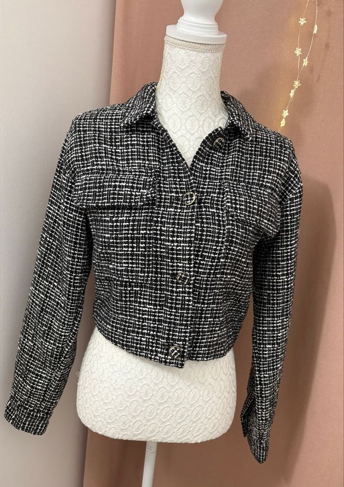 🖤 Veste courte effet tweed AMISU – Taille 36 🖤 🧵 Détails : • Marque : AMISU • Taille : 36 • Coupe courte tendance 💫 • Boutons décoratifs argentés • Matière texturée effet tweed 💌 Envoi rapide & soigné