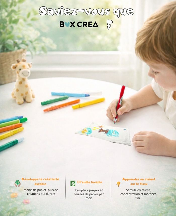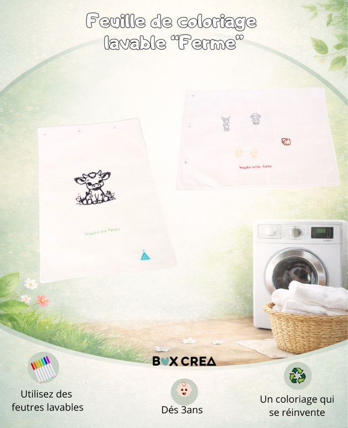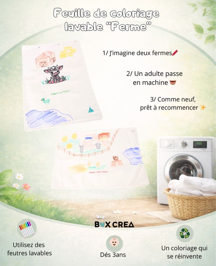 Coloriez, lavez et recommencez… sans jamais jeter 🌿 Une activité créative et durable dès 3 ans qui transforme le coloriage en jeu infini. Idéale pour développer motricité fine, imagination et créativité, seule ou pour compléter les box BoxCréa. ⸻ ✨ Ce qui la rend unique • 🐮 Animaux de la ferme à colorier : inventez des histoires et donnez vie à votre univers • 🌾 Décor de ferme brodé : observez, cherchez et continuez le dessin • 🧵 Broderies en relief : aident à ne pas dépasser et développent précision et motricité fine • 🖊️ Compatible avec feutres lavables et les cahiers BoxCréa • 📲 QR code inclus : accès à la notice complète et aux idées créatives ⏱ Environ 1 à 2h d’activité, à refaire encore et encore. ⸻ 🌱 Durable et réutilisable • Lavable en machine à 30 °C • Réutilisable à l’infini • Alternative responsable aux cahiers de coloriage papier