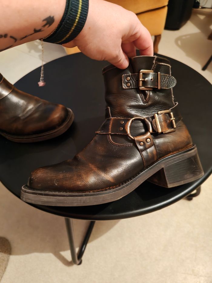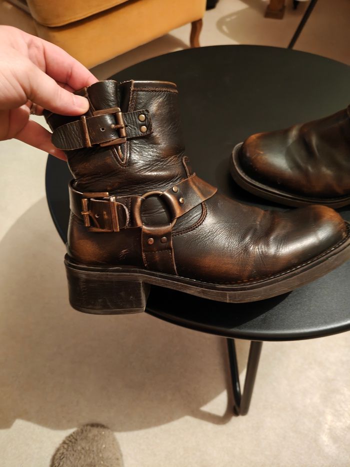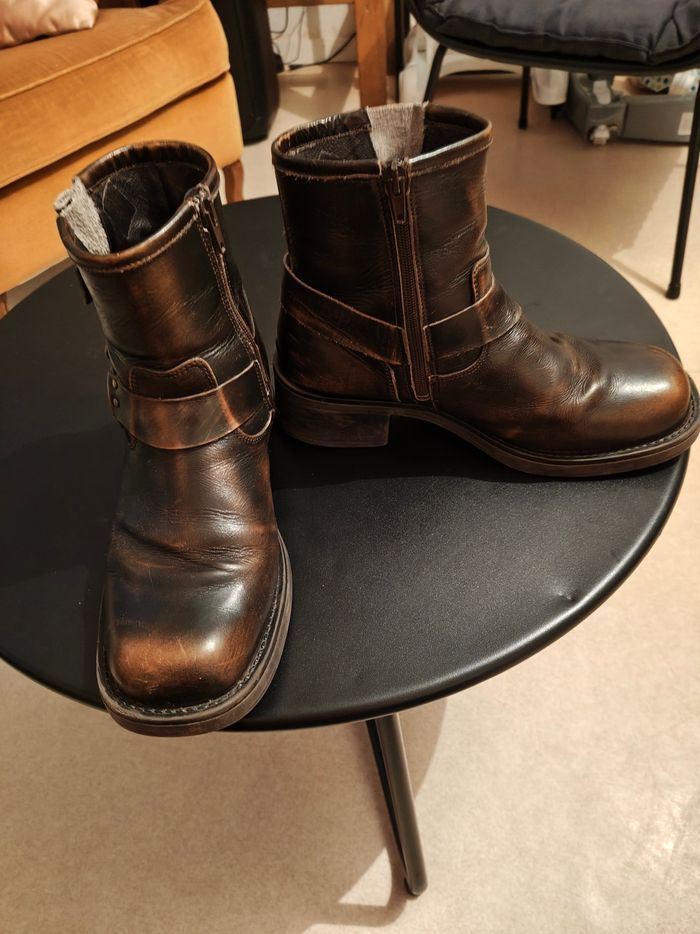 Bottine pointure 41 en cuir acheté a souliers et compagnie 120€ mais suite a un soucis de pied je ne peux plus les porté. Porté quelquefois (jamais une journée entière) mais reste propre car j'en ai pris soin imperméabilisant plus cire.