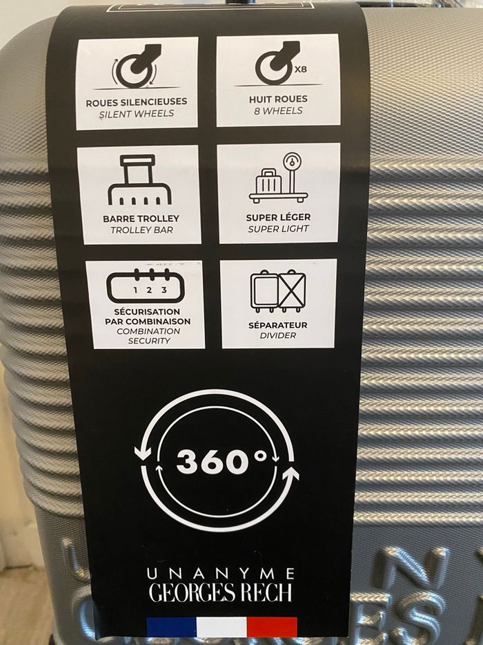 Valise cabine taille S couleur :gris marque :Georges rech ABS 360⁰ Bonne qualité. Solide et légère Les dimensions : 34,5x22x55,3 cm 20pouces 39 litres Valise taille S Composition Extérieur ABS, tissus intérieur en polyester, poignée souple, cadenas à combinaison, chariot en fer, 4 roues pivotantes à 360 degrés, doubles roues. Emballage soigné Envoie rapide prix :30€