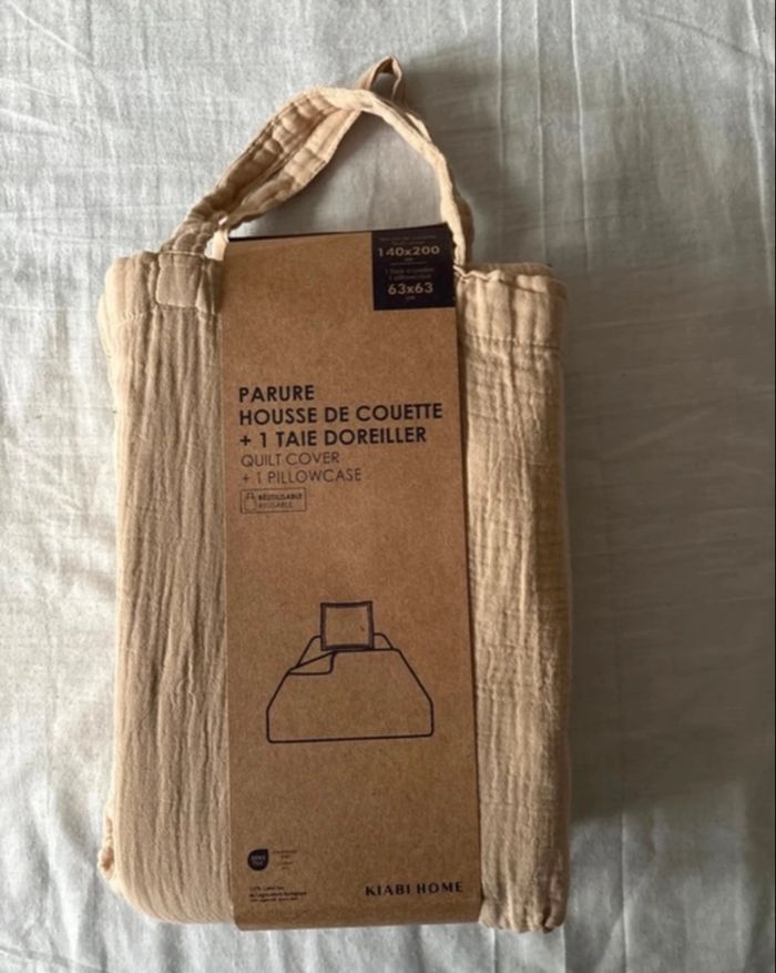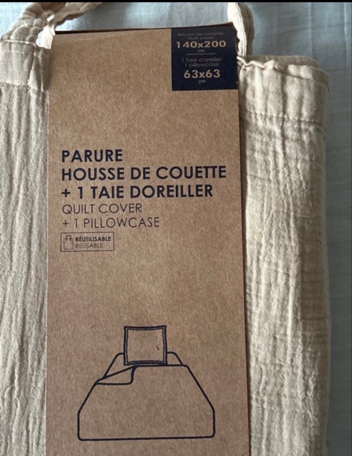 💛 Parure housse de couette 1 personne – Gaz de coton – Beige sable – NEUVE Succombez au charme de cette parure en gaz de coton, à la texture naturellement gaufrée, ultra douce et respirante. Elle est neuve, jamais utilisée, avec son emballage d’origine. ✨ Détails : • 🛏️ Housse de couette 140 x 200 cm (1 personne) • 💤 + 1 taie d’oreiller 63 x 63 cm incluse • 🌿 Matière : gaz de coton (léger, confortable, idéal toute l’année) • 🎨 Couleur : beige sable / lin, chaleureuse et intemporelle • 🏷️ Marque : Kiabi Home • ✅ État : neuf Parfaite pour une ambiance naturelle, bohème ou minimaliste 🌾 Apporte une sensation de linge doux et élégant, esprit maison de vacances ✨ Idéale aussi comme cadeau chic et utile 🎁
