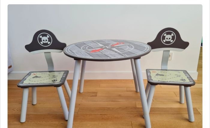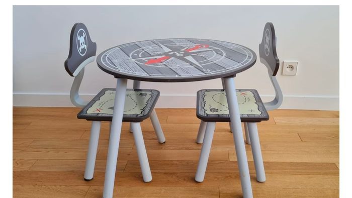 Ensemble pirate tout en bois : 1 table + 2 chaises pour enfant. Très robuste et laqué. Résistant à l'humidité. Table ronde motif boussole : Diamètre 60cm, hauteur 48cm et 4 pieds. 2 chaises : Hauteur de l’assise 48cm, largeur de de l’assise 30cm et hauteur de la chaise avec le dossier 60cm Bon état général. Quelques accrocs ou marques visibles sur les photos. Étant donné la taille du mobilier, envoie non possible. Uniquement remise en mains propres sur Paris 12.
