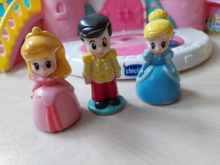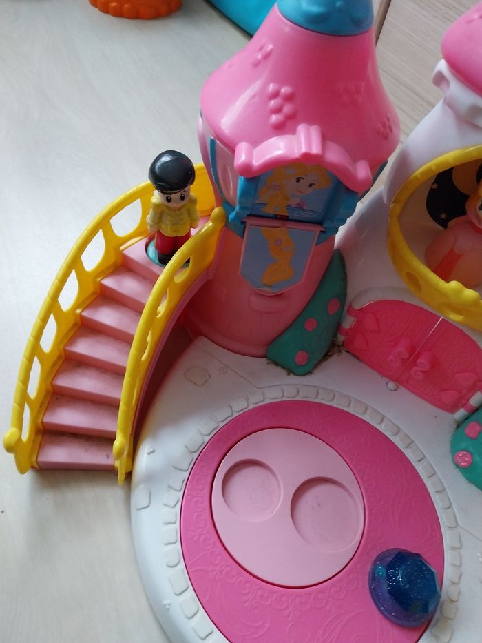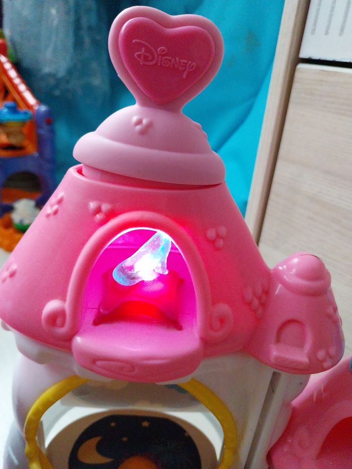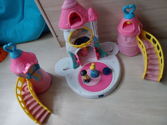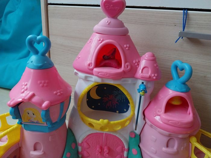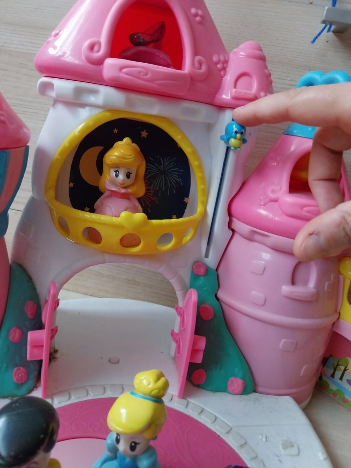 Château princesse disney avec 2 princesses et 1 prince La chaussure s'allume qu'en on appuie sur le cœur L'oiseau fait monter ou descendre l'ascenseur