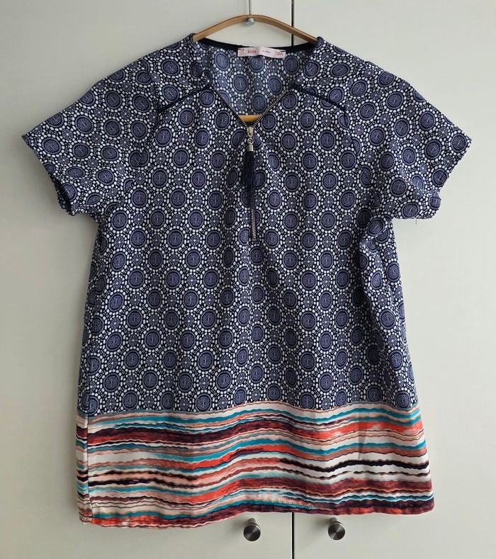 Blouse de marque Gémo, manches courtes, taille 12 ans, 100% polyester. Motifs multicolore, fermeture éclair sous col.