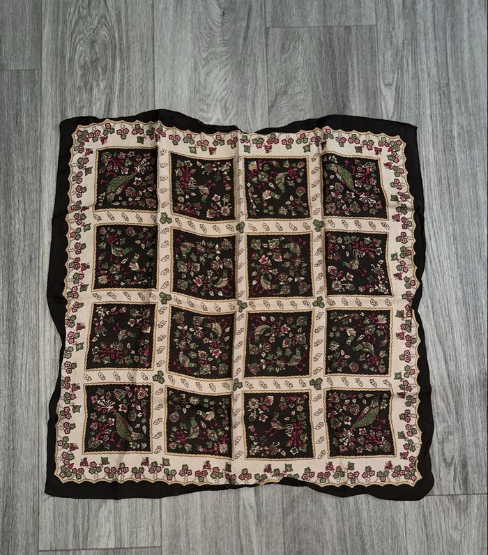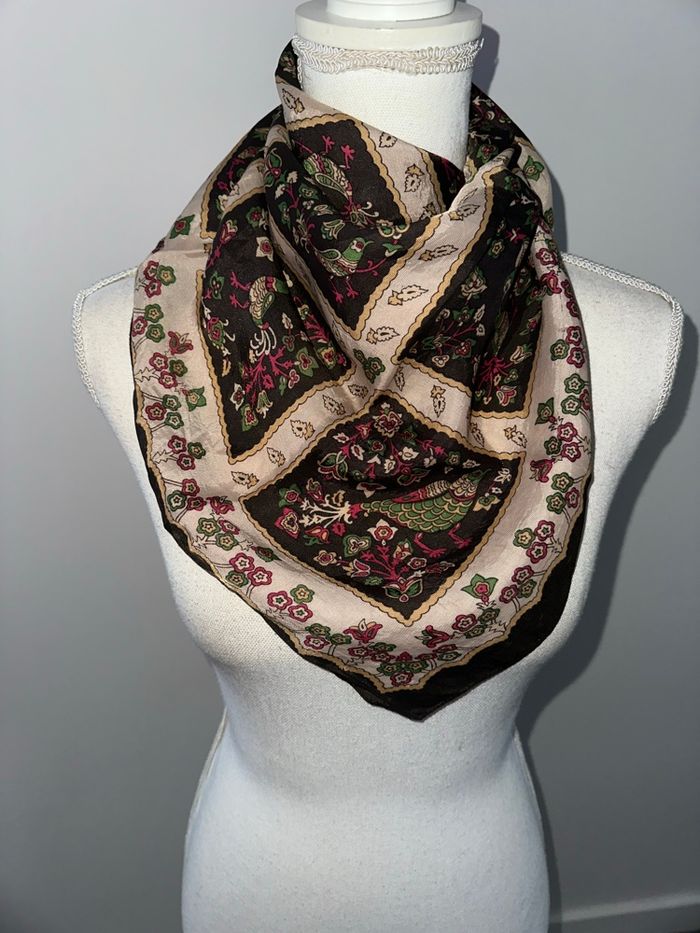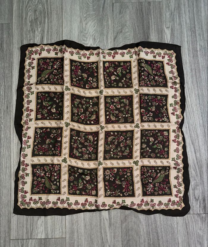 Foulard - Excellent état - Marron, beige, vert et rose - Imprimés oiseaux, faisans, paons - Forme carrée - 100% Soie - 63x63cm - Vintage, années 1970-1980