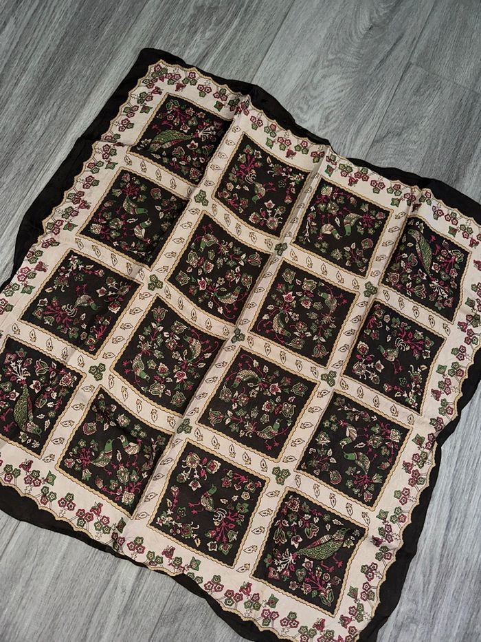 Foulard carré de soie marron beige oiseaux faisans paons Vintage 63x63cm - photo numéro 1