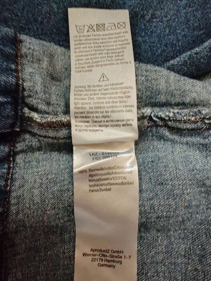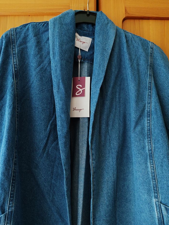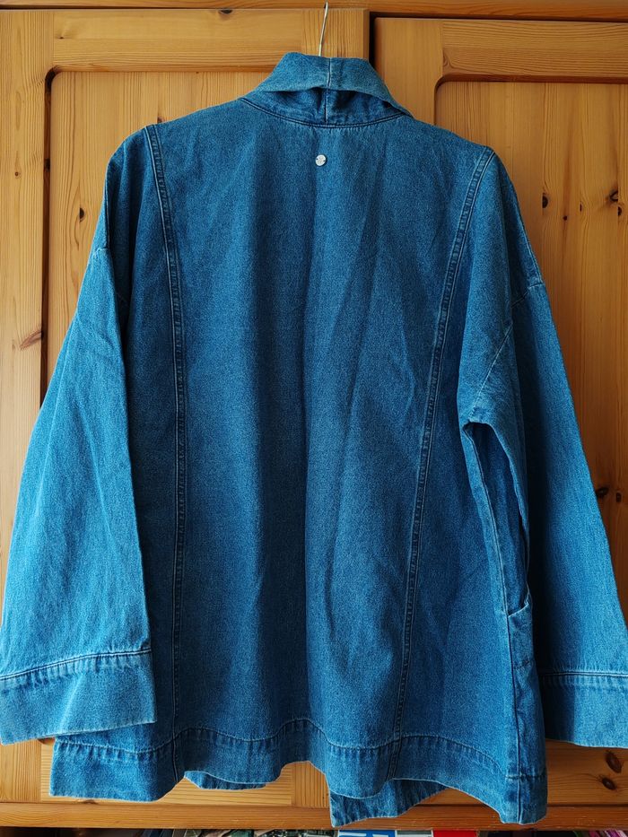 Veste longue en jean bord à bord. Manches larges. 2 grandes poches. Taille grand peut convenir jusqu au 46 48.