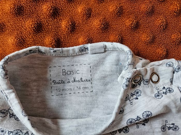 T-shirt manches courtes ( MC ) gris motif vélo, boîte à malice, 12 mois (74 cm) avec boutons pression sur l'épaule. Très bon, état sans trou ni tâche. D'autres vêtements sont disponibles dans mon dressing en taille 12mois