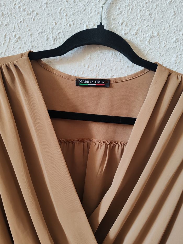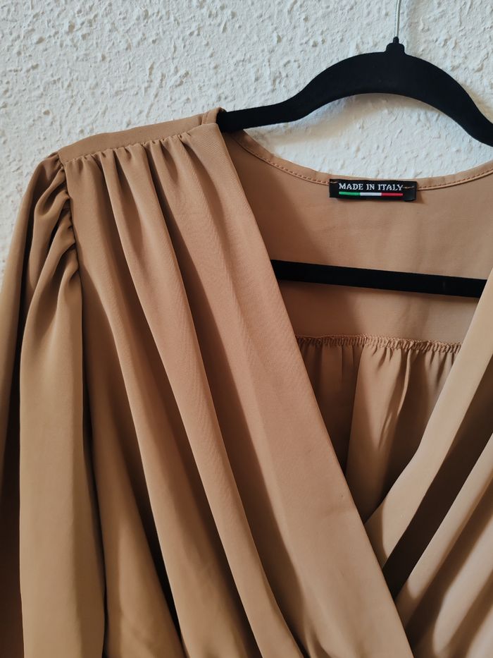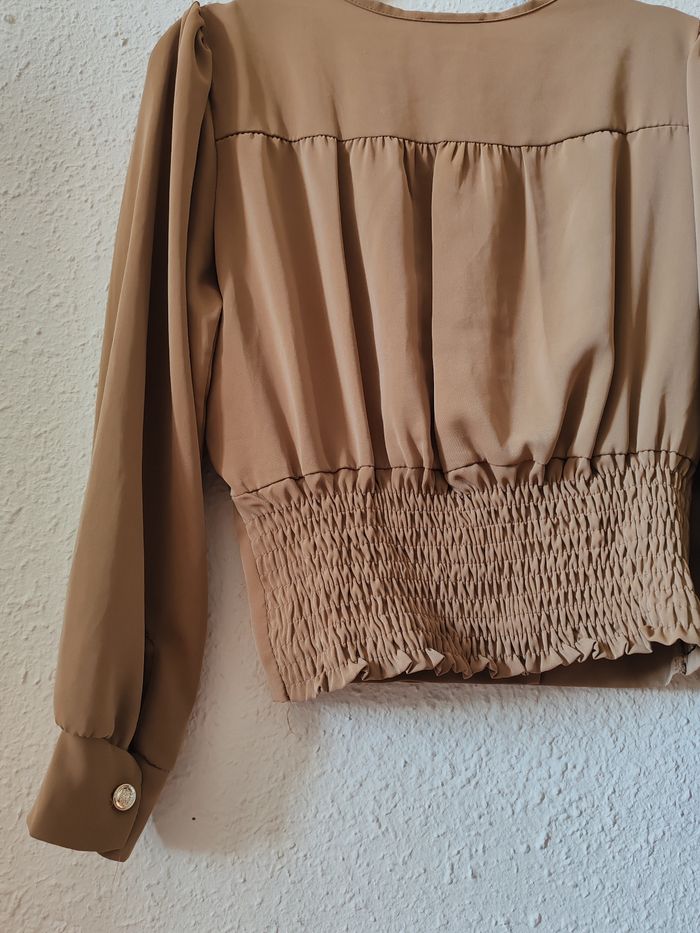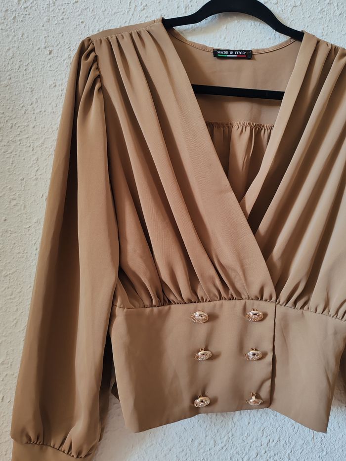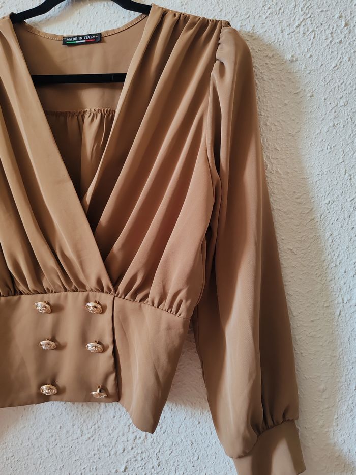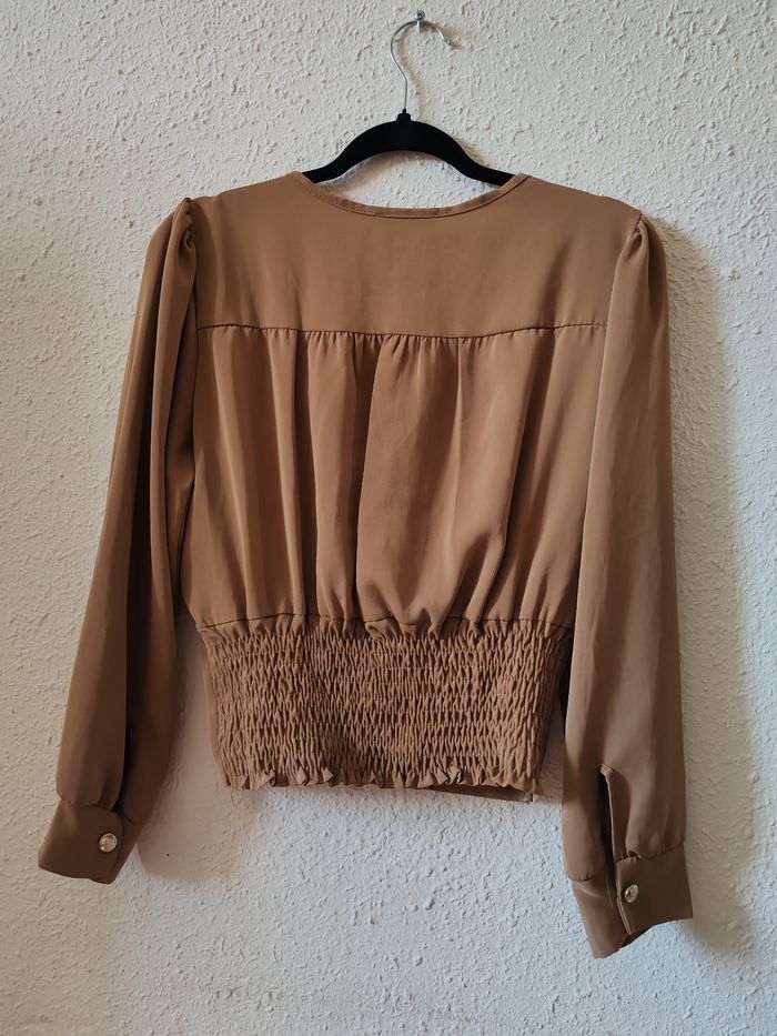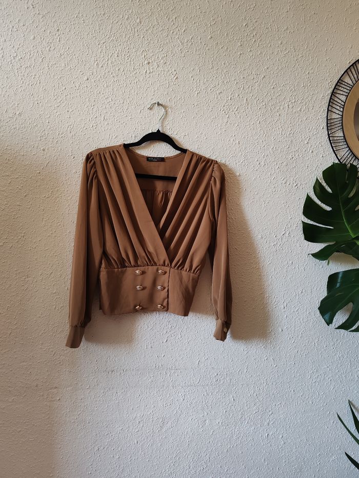 ✨ haut beige à manches longues, acheter en boutique indépendante, avec décolleté en v drapé. Élastiqué dans le dos. 📏 Taille unique me convient plutôt un S. 🏷️ Bon état, voir photos, le décolleté est en assez prononcé je le faisais tenir avec une broche qui a laissé des marques. 📦 Envoie rapide et soigné