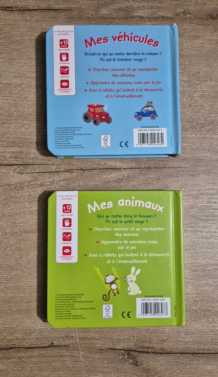Lot de 2 livres imagier cache-cache avec volets cartonnés à soulever : - Mes véhicules - Mes animaux Parfait état