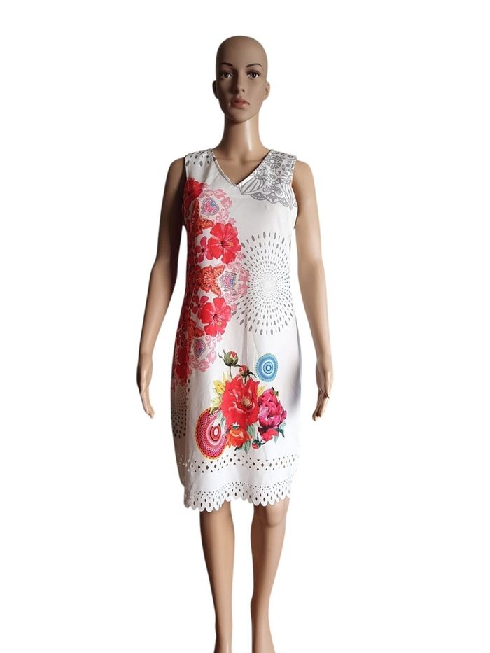 🌞 Adoptez un look solaire et original avec cette robe d'été sans manches de la célèbre marque 101 Idées. Parfaite pour la saison estivale, cette pièce unique combine l'élégance d'un imprimé floral rouge éclatant (fleurs d'hibiscus) avec le graphisme moderne de motifs mandalas et ethniques. 💖 Pourquoi on l'adore 💖  🤍 Design Original : Un mélange de couleurs blanc, rouge et gris, typique de la mode espagnole et portugaise, idéal pour celles qui cherchent une robe colorée et atypique. ❤️ Détails Féminins : Son décolleté en V flatteur et son dos nu goutte d'eau apportent une touche de sensualité. On craque particulièrement pour sa bordure inférieure en découpe laser ajourée, offrant un effet dentelle moderne et léger. 🩶 Matière Confortable : Conçue en tissu fluide (95% polyester, 5% élasthanne), cette robe stretch épouse vos formes sans serrer et présente l'avantage d'être infroissable—la tenue de vacances idéale à glisser dans sa valise ! 🏷 Marque : 101 Idées  👗 Coupe : Robe courte droite / Coupe trapèze légère. 🔸️ Style : Arty, Bohème chic, Casual élégant. 🏠 Prix boutique : 59€ 📐Taille : Étiquette L/XL  📏 Pour vous assurez qu'elle vous ira parfaitement fiez-vous à la grande sagesse de Maître Ruban ⤵️  Aisselle à Aisselle : 47cm Longeur : 94cm 👉Que ce soit pour une cérémonie, une sortie en ville ou une tenue de plage habillée, cette robe polyvalente deviendra vite un incontournable de votre dressing. 🌟 Très bon état 🌟  📦 Envoi rapide et soigné